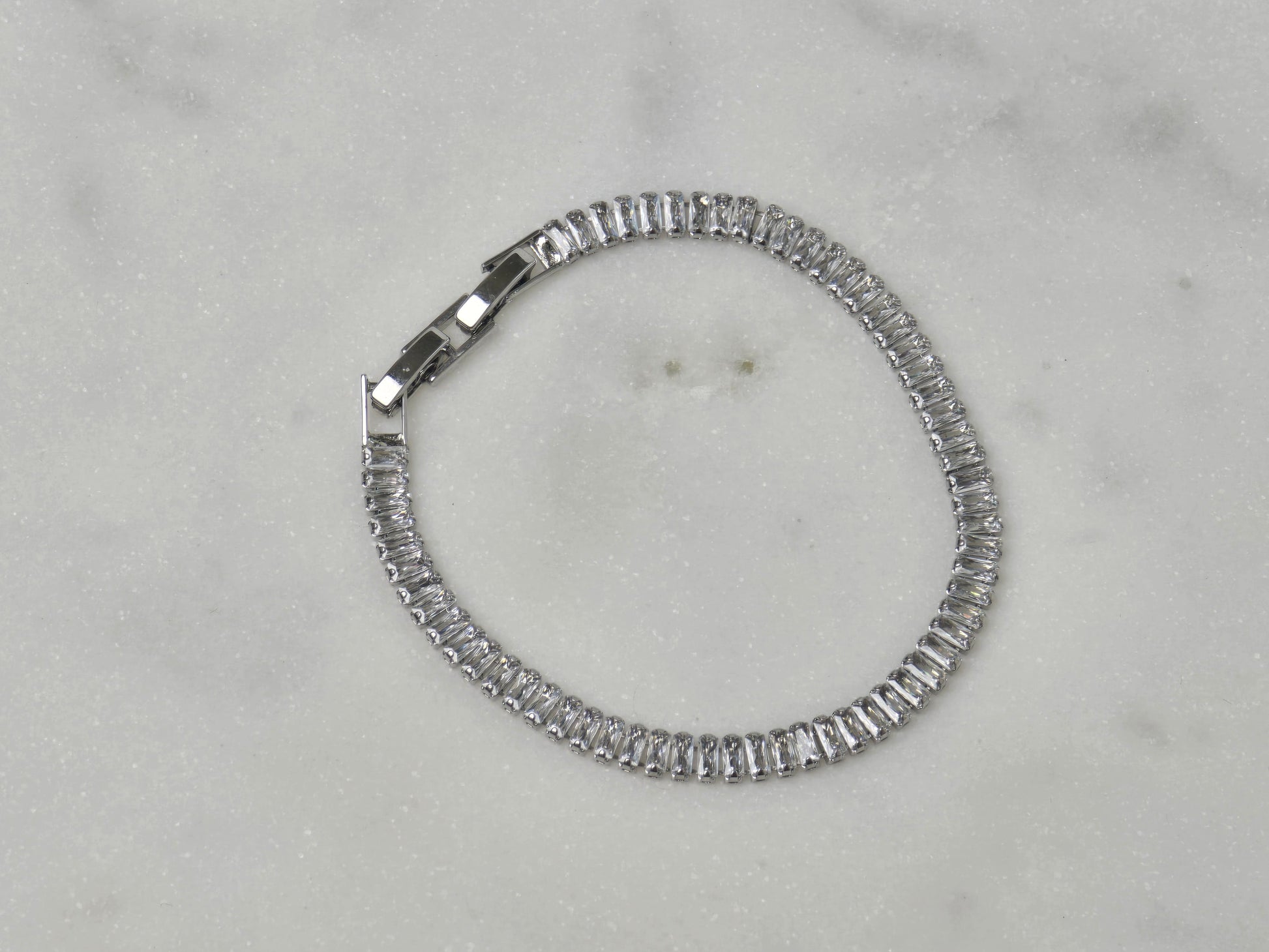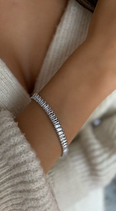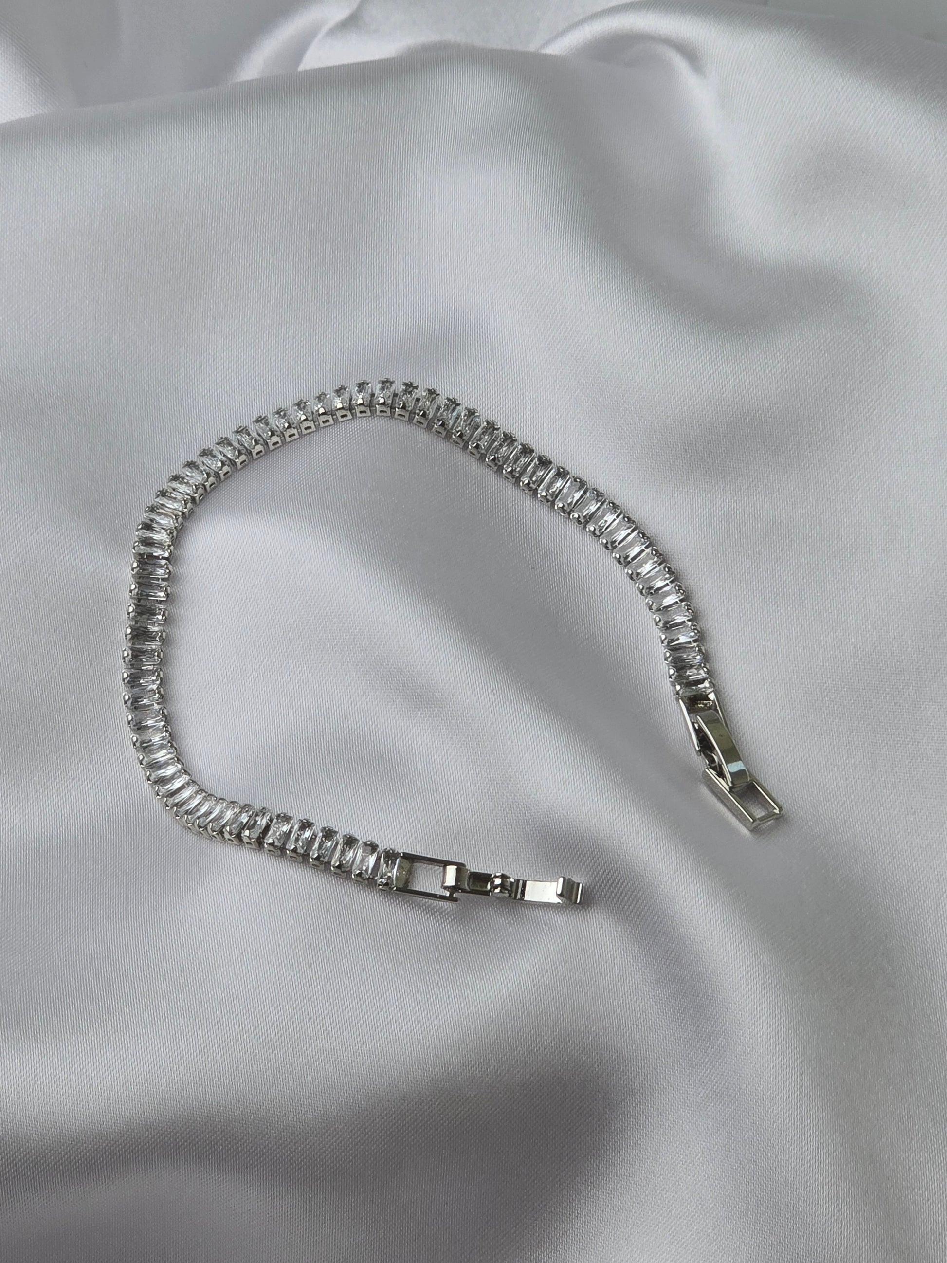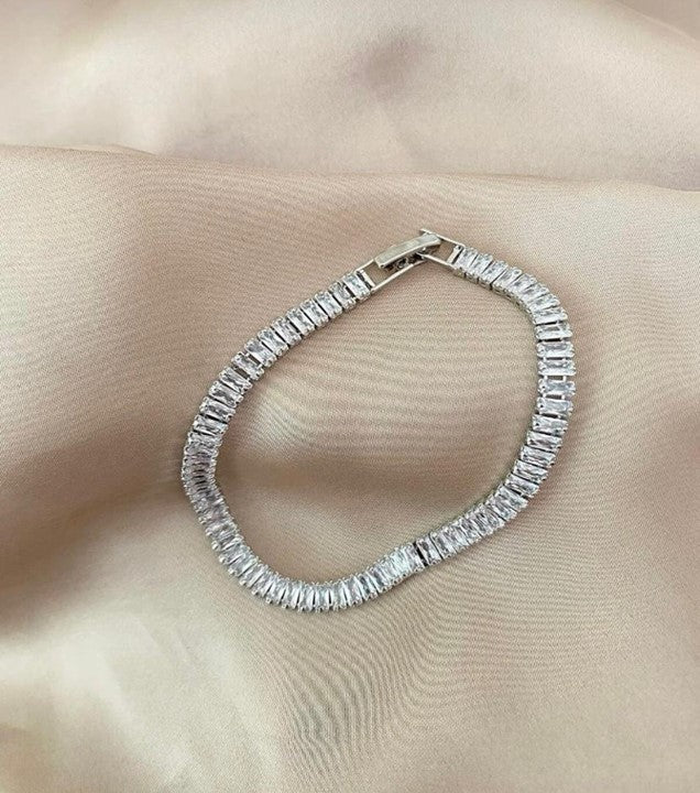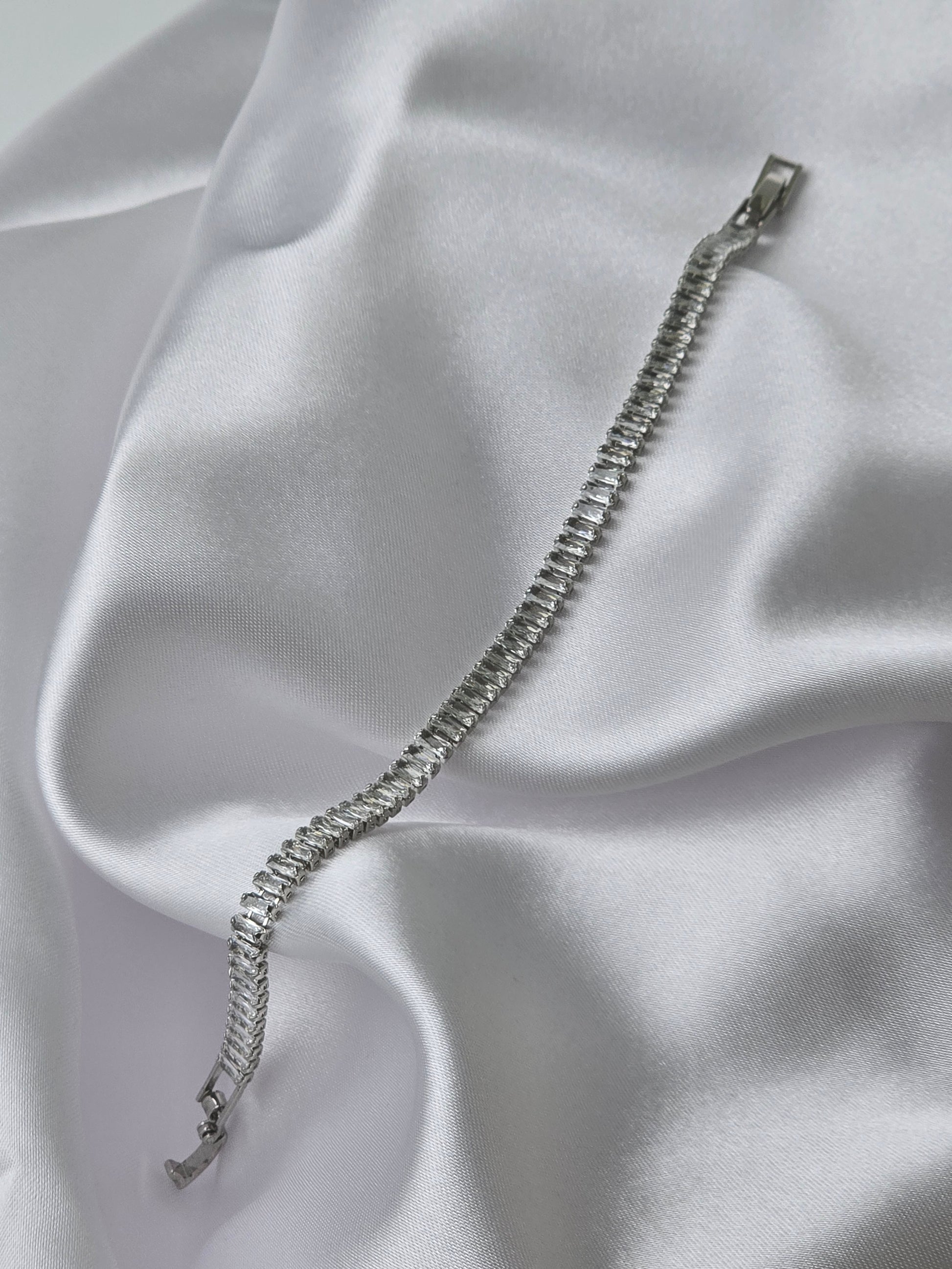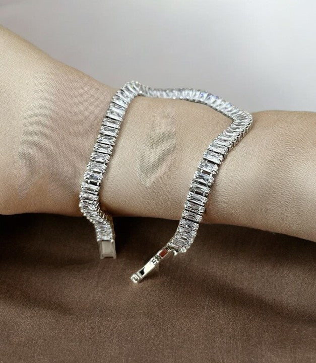 Sculpted in pure 92.5 sterling silver, this bracelet features a flawless stream of baguette-cut crystals, designed to catch light from every angle. Its clean silhouette and timeless brilliance make it a modern classic for every jewellery collection.