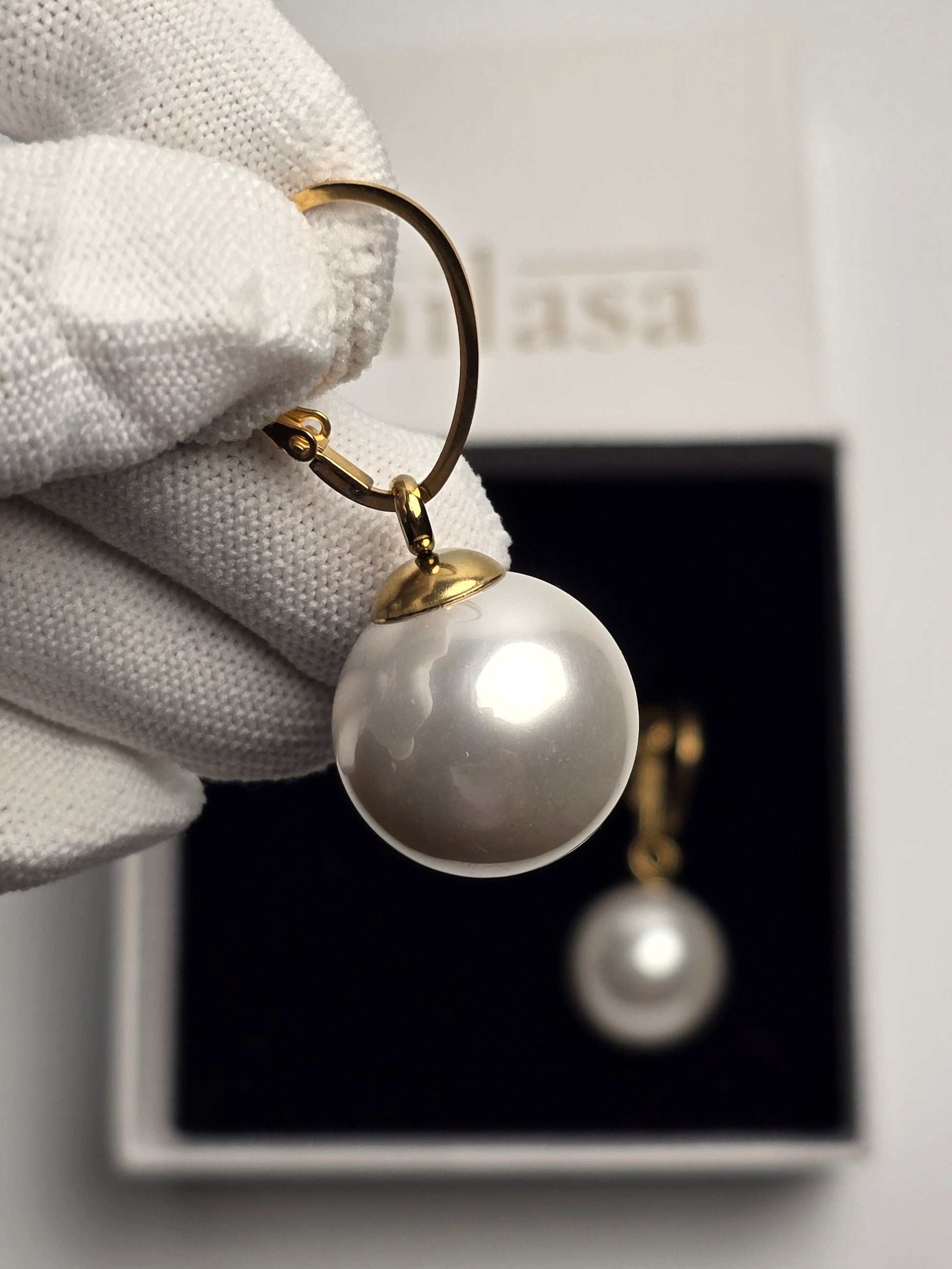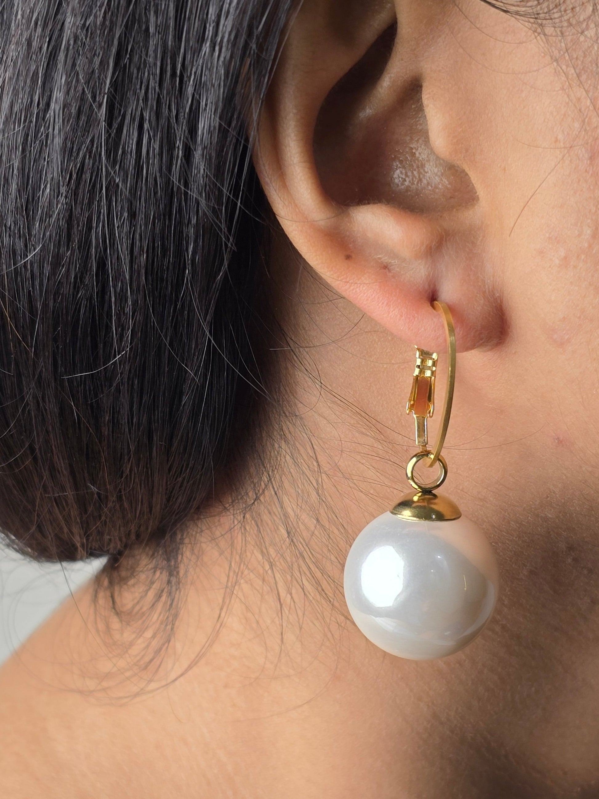 A statement pearl drop earring from our Pearl Collection, featuring a bold, luminous orb suspended from a sleek gold hoop. Designed for effortless sophistication, it’s hypoallergenic, tarnish-free, and made to elevate both everyday and occasion wear.