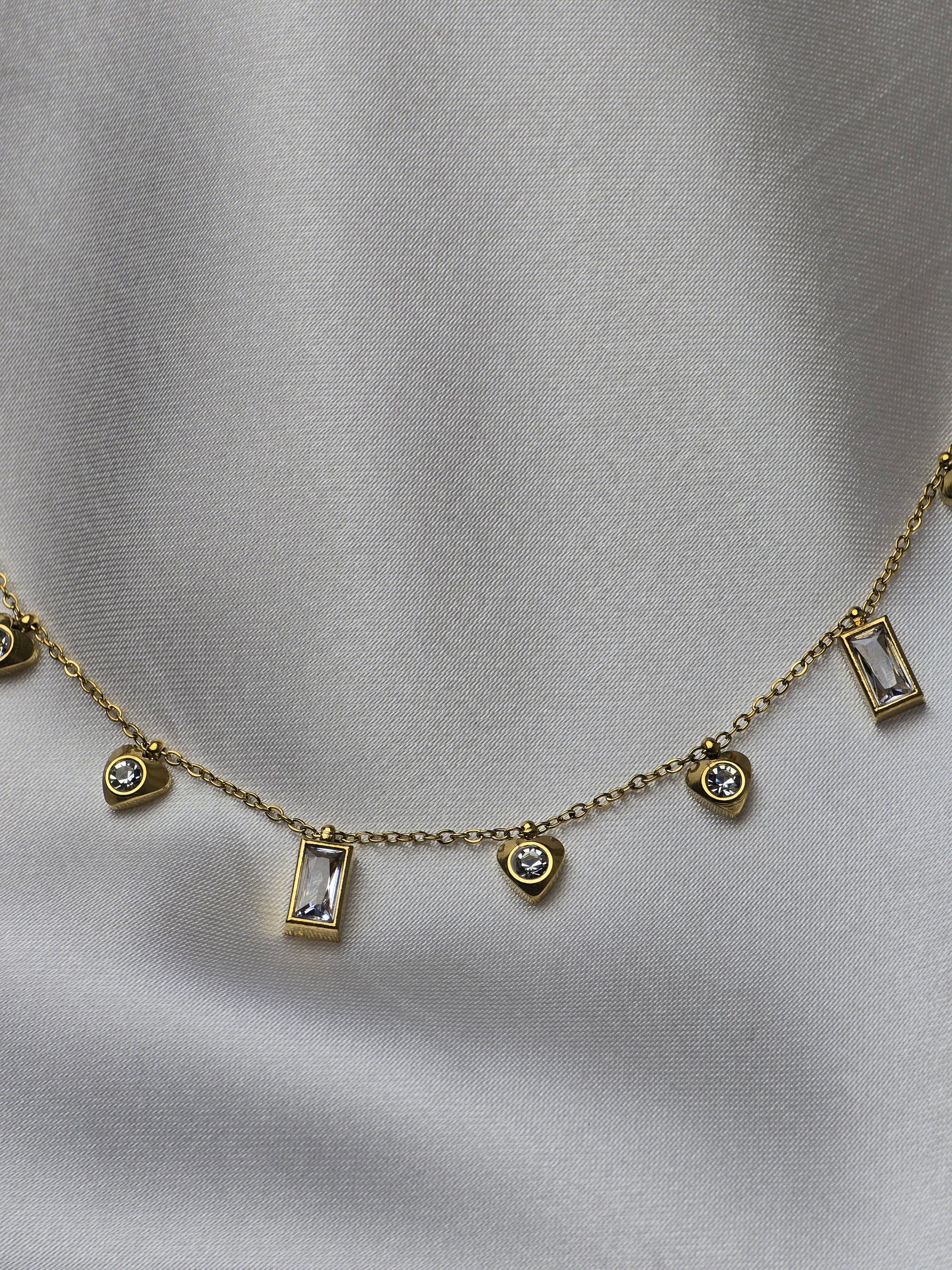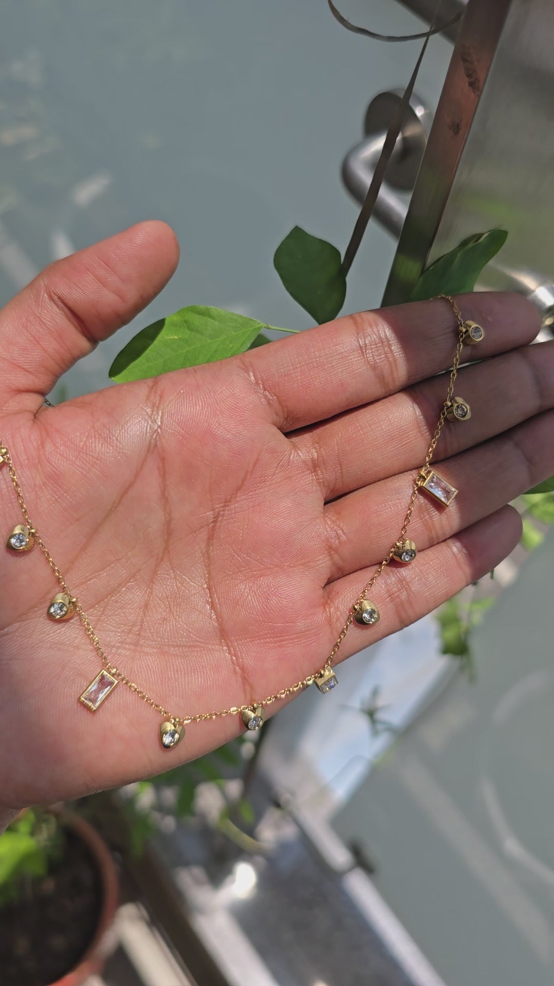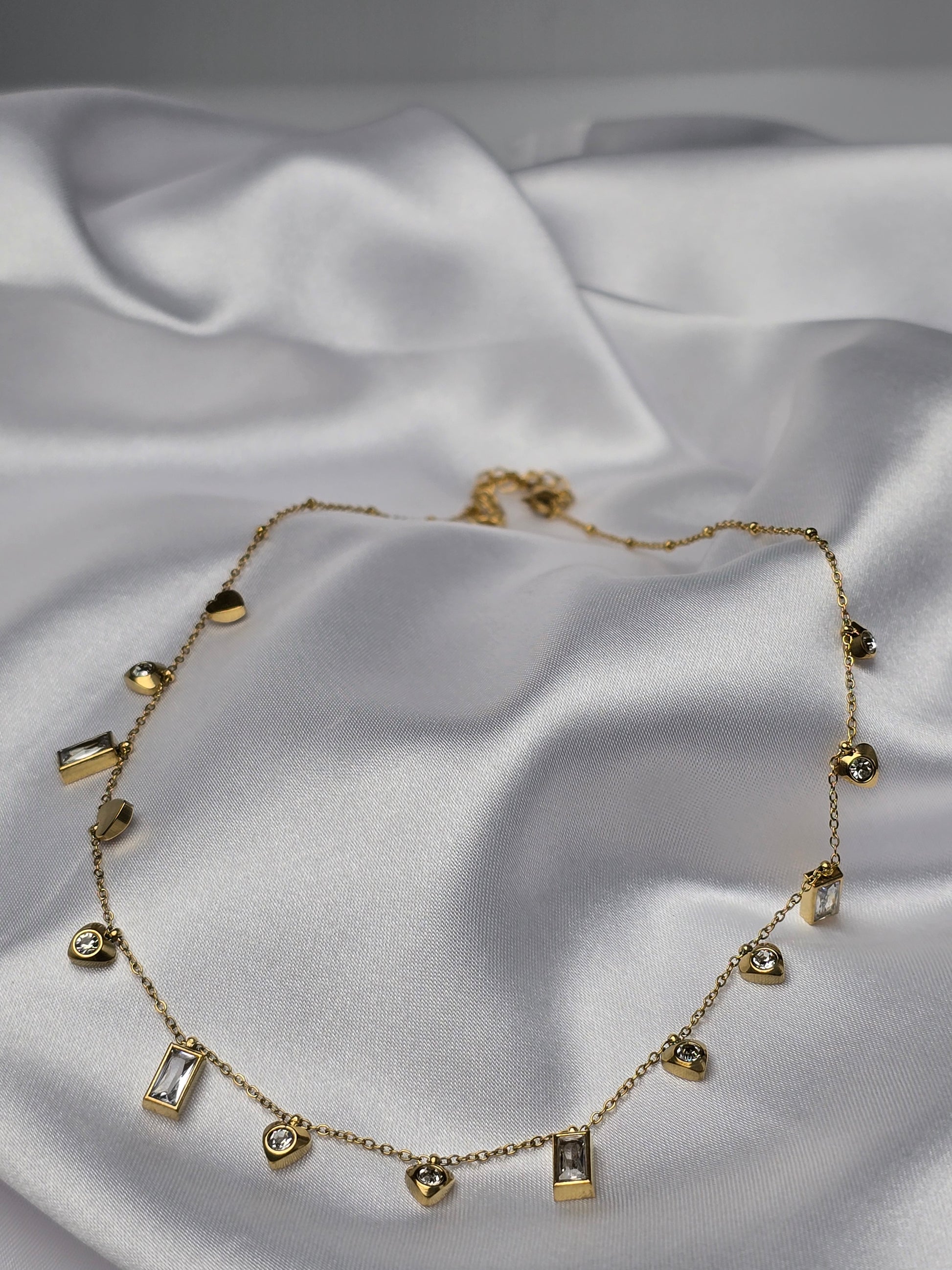 Styling Tip: Highlight the necklace’s elegant structure and subtle shimmer by wearing it with a clean, open neckline—such as an off-shoulder or scoop neck top. Pair it with minimalist studs and a sleek bun or low ponytail to keep the focus on the necklace’s refined detailing.