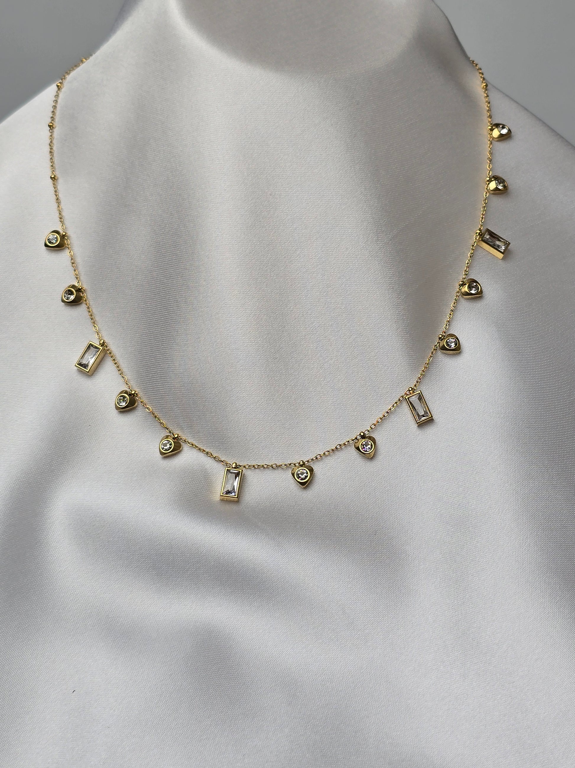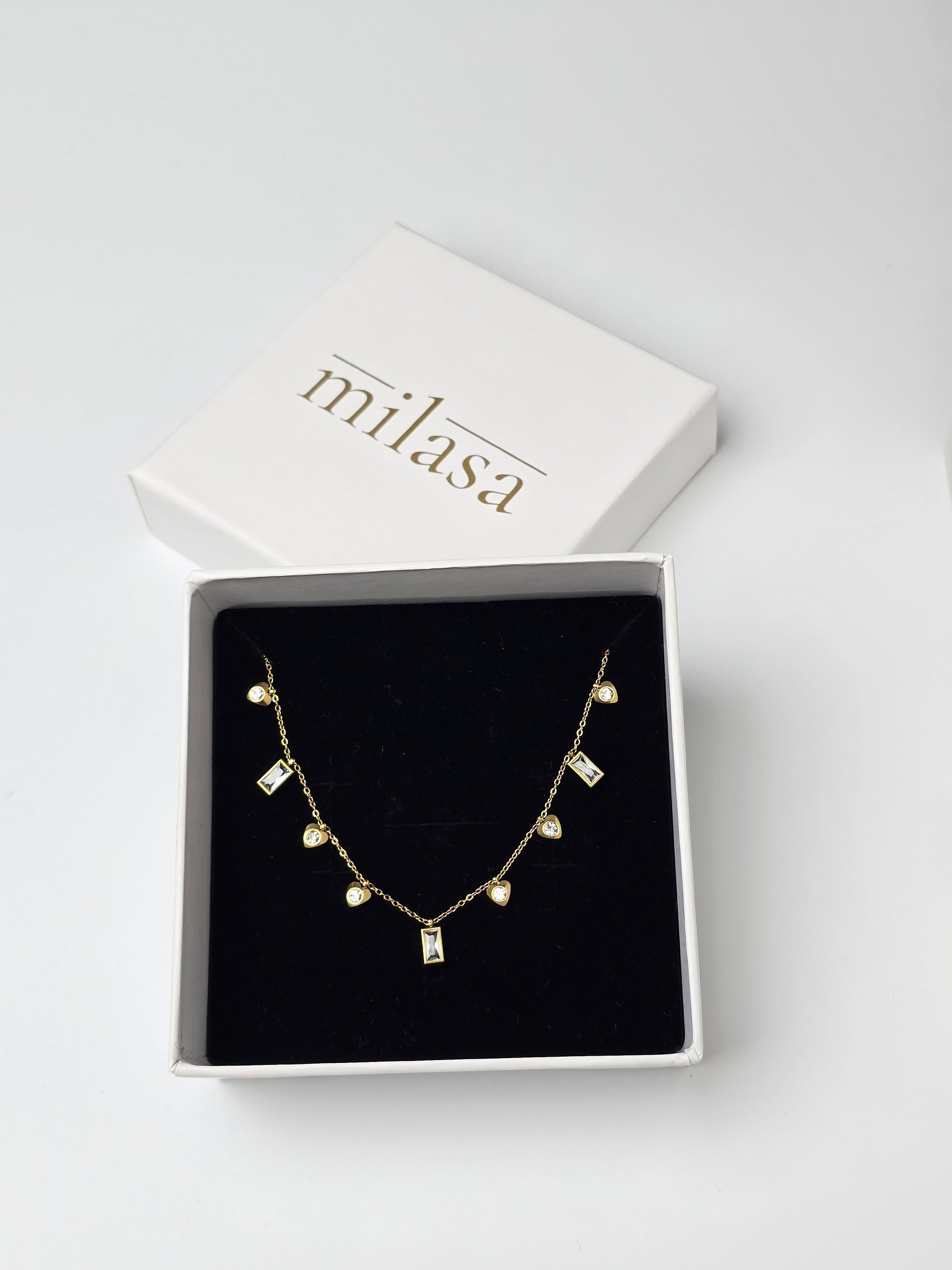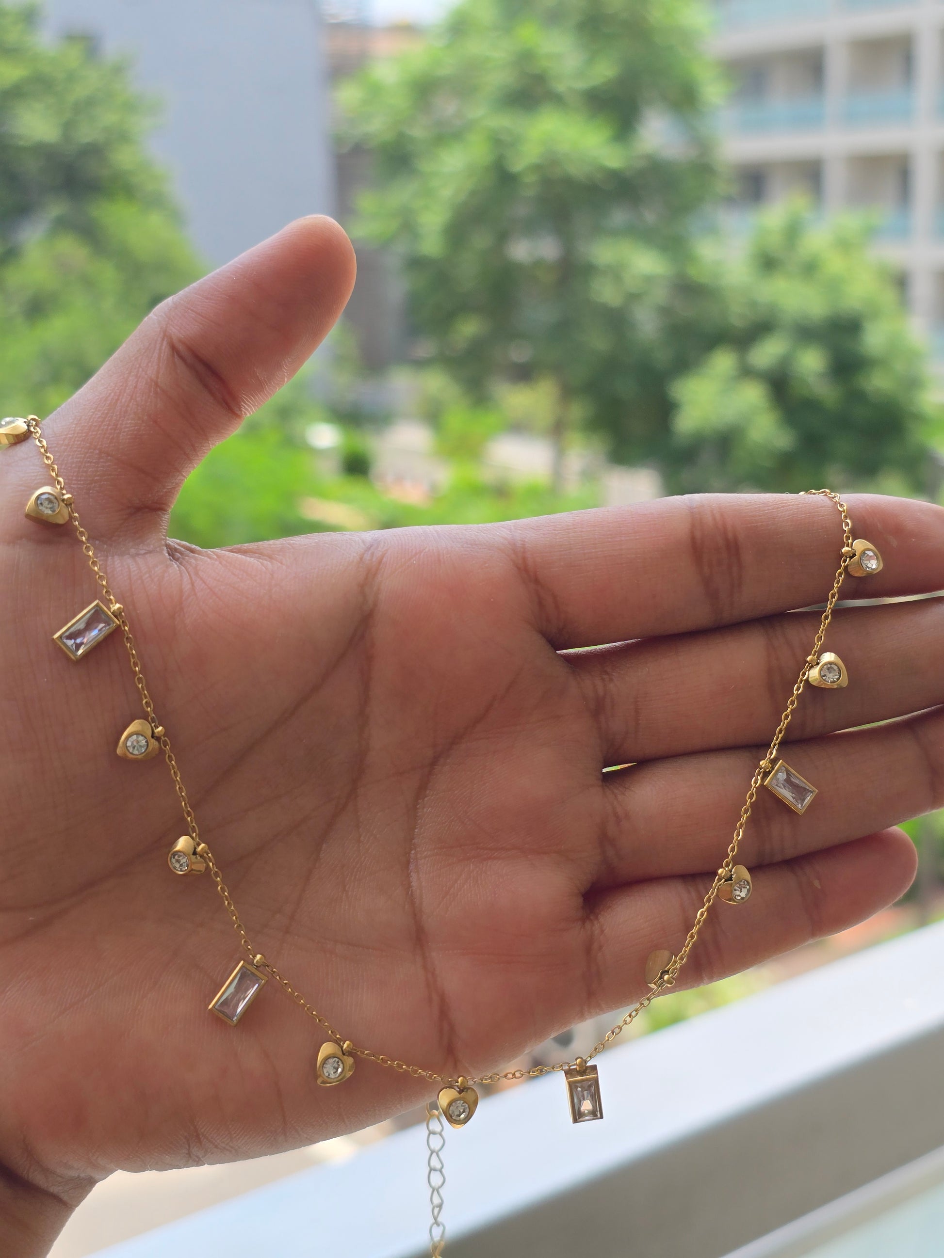 Styling Tip: Highlight the necklace’s elegant structure and subtle shimmer by wearing it with a clean, open neckline—such as an off-shoulder or scoop neck top. Pair it with minimalist studs and a sleek bun or low ponytail to keep the focus on the necklace’s refined detailing.