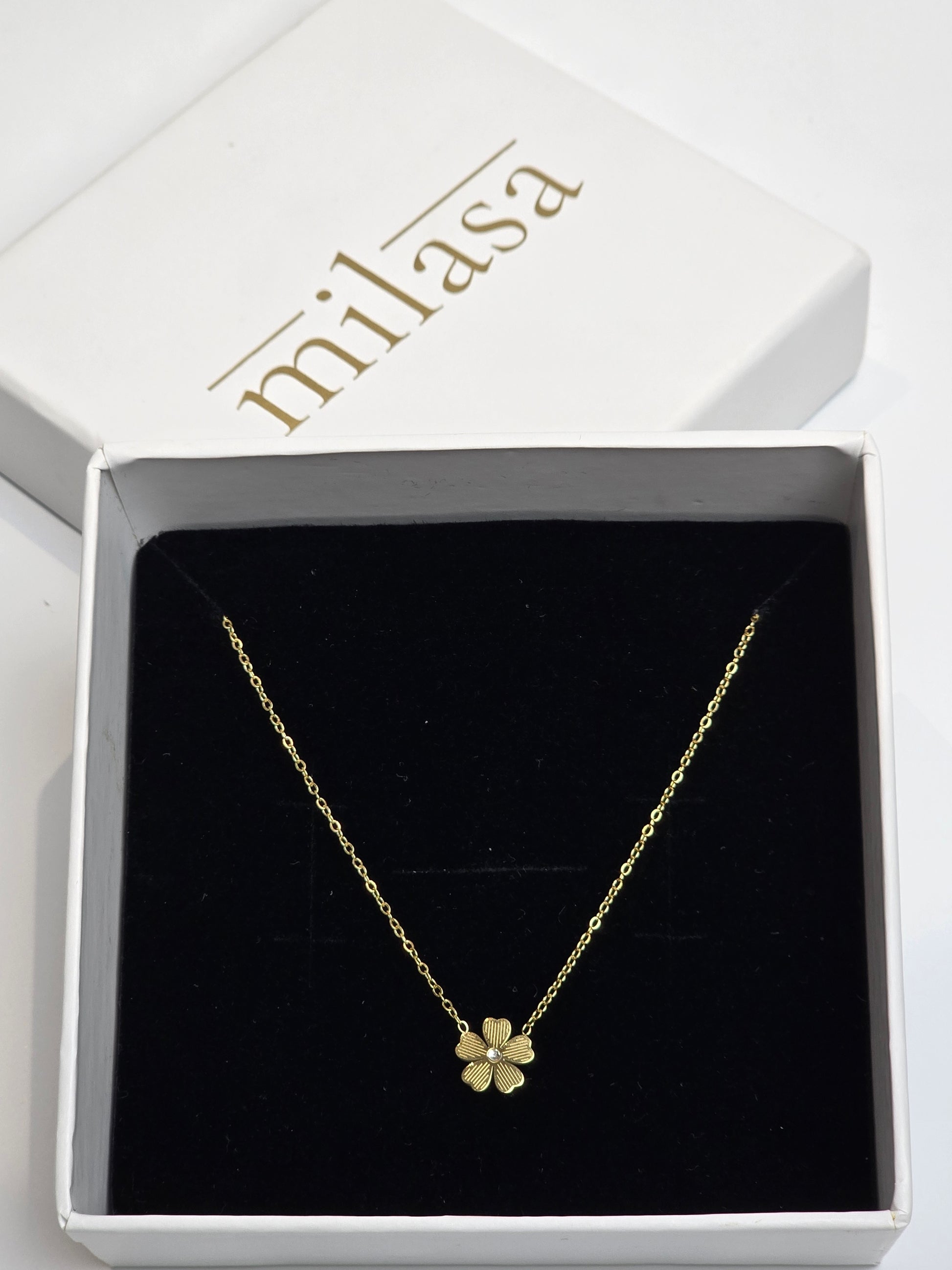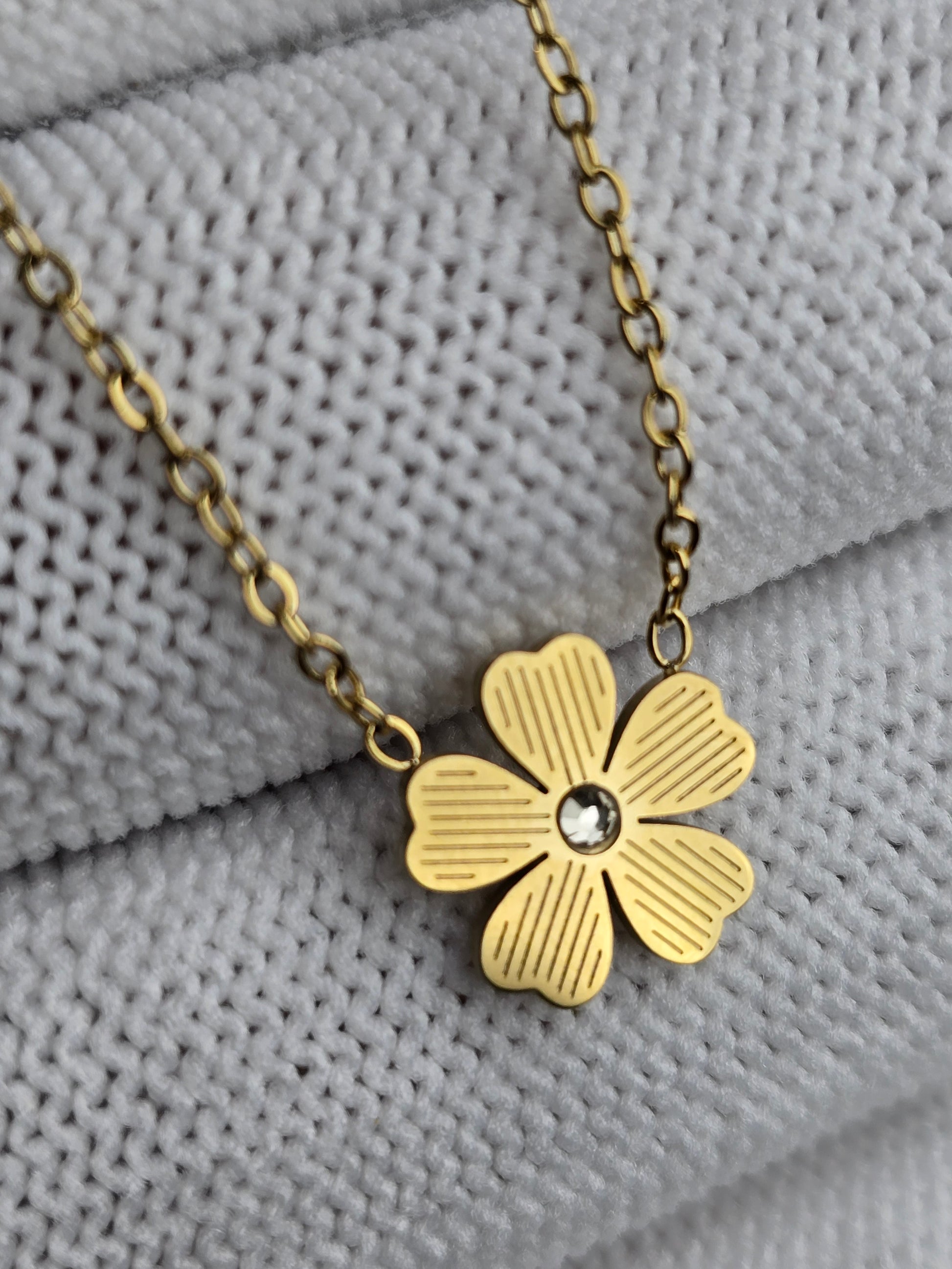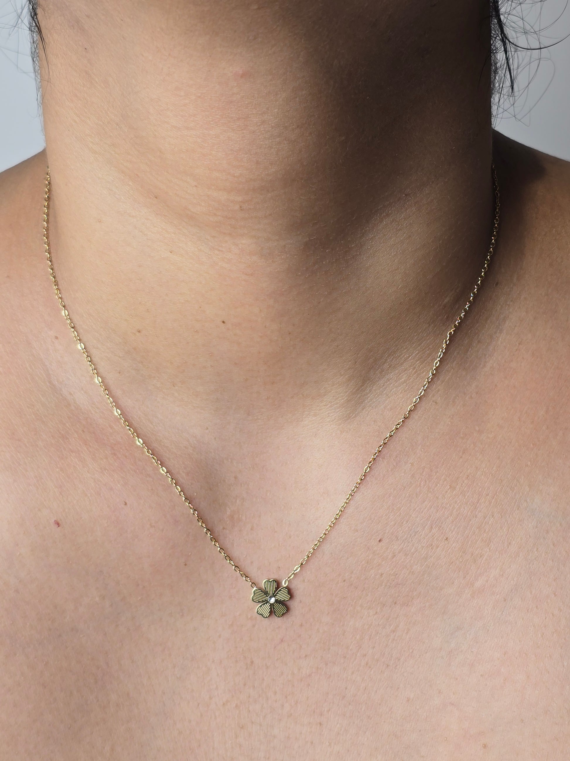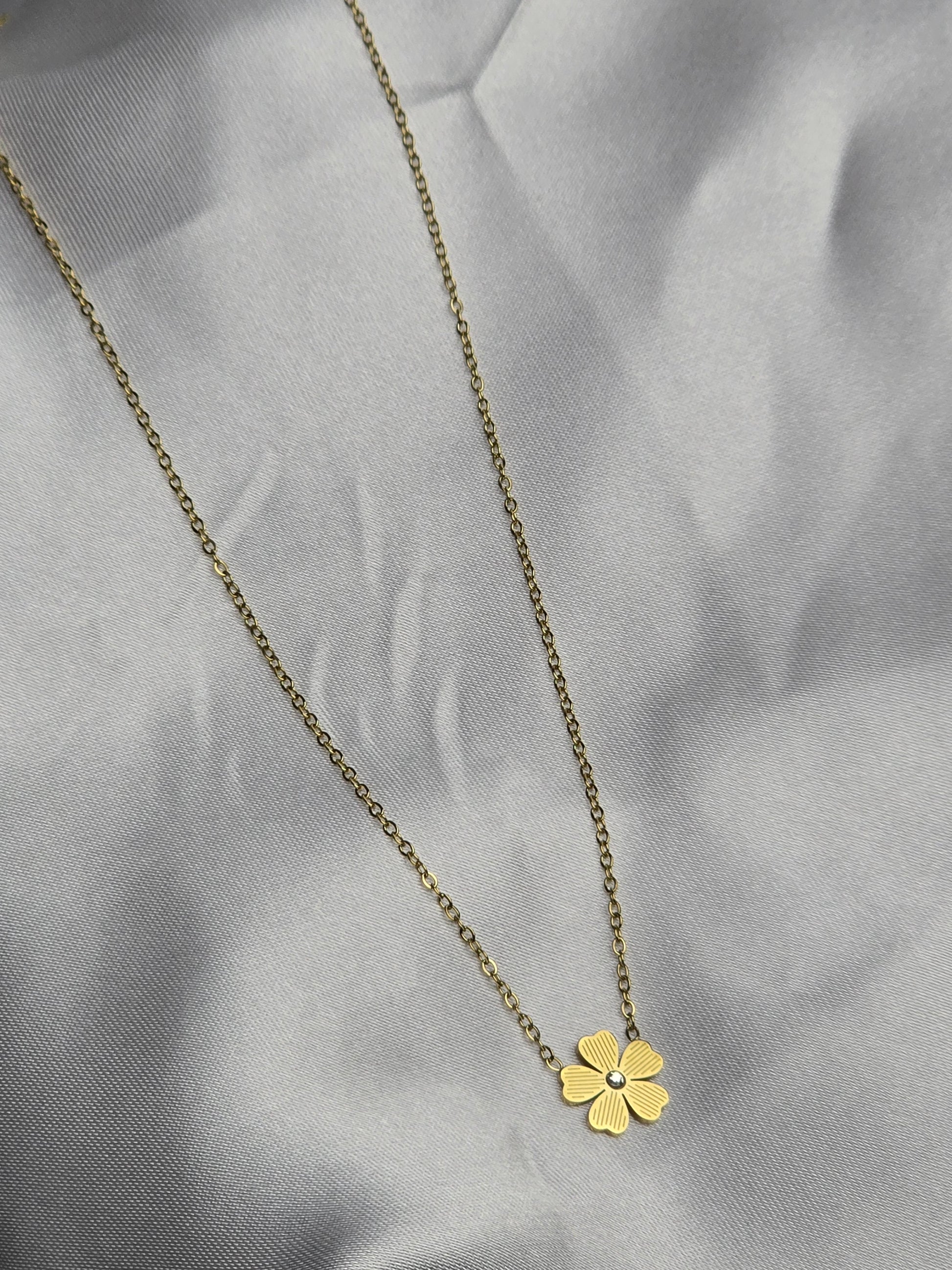 This gold-toned necklace features a dainty four-petal flower pendant, symbolizing elegance and grace. Lightweight and versatile, it's perfect for everyday wear or as a subtle accent for special occasions.
