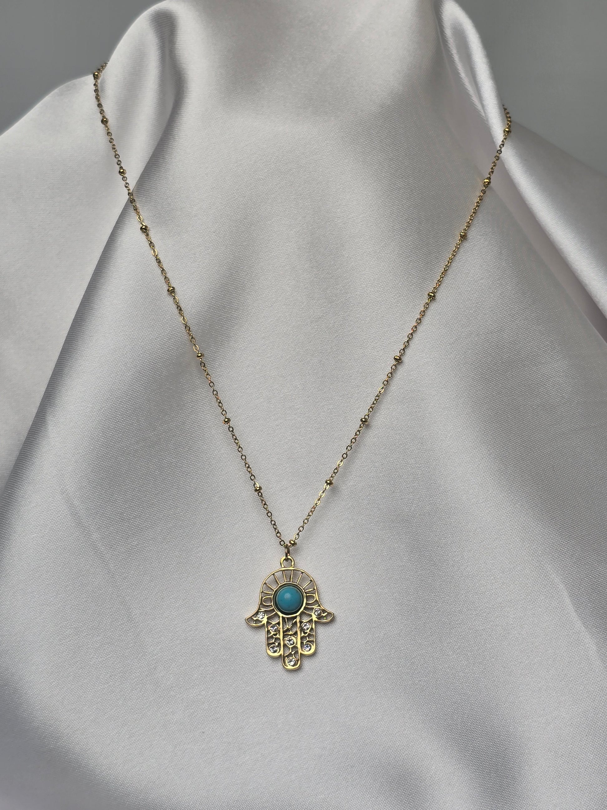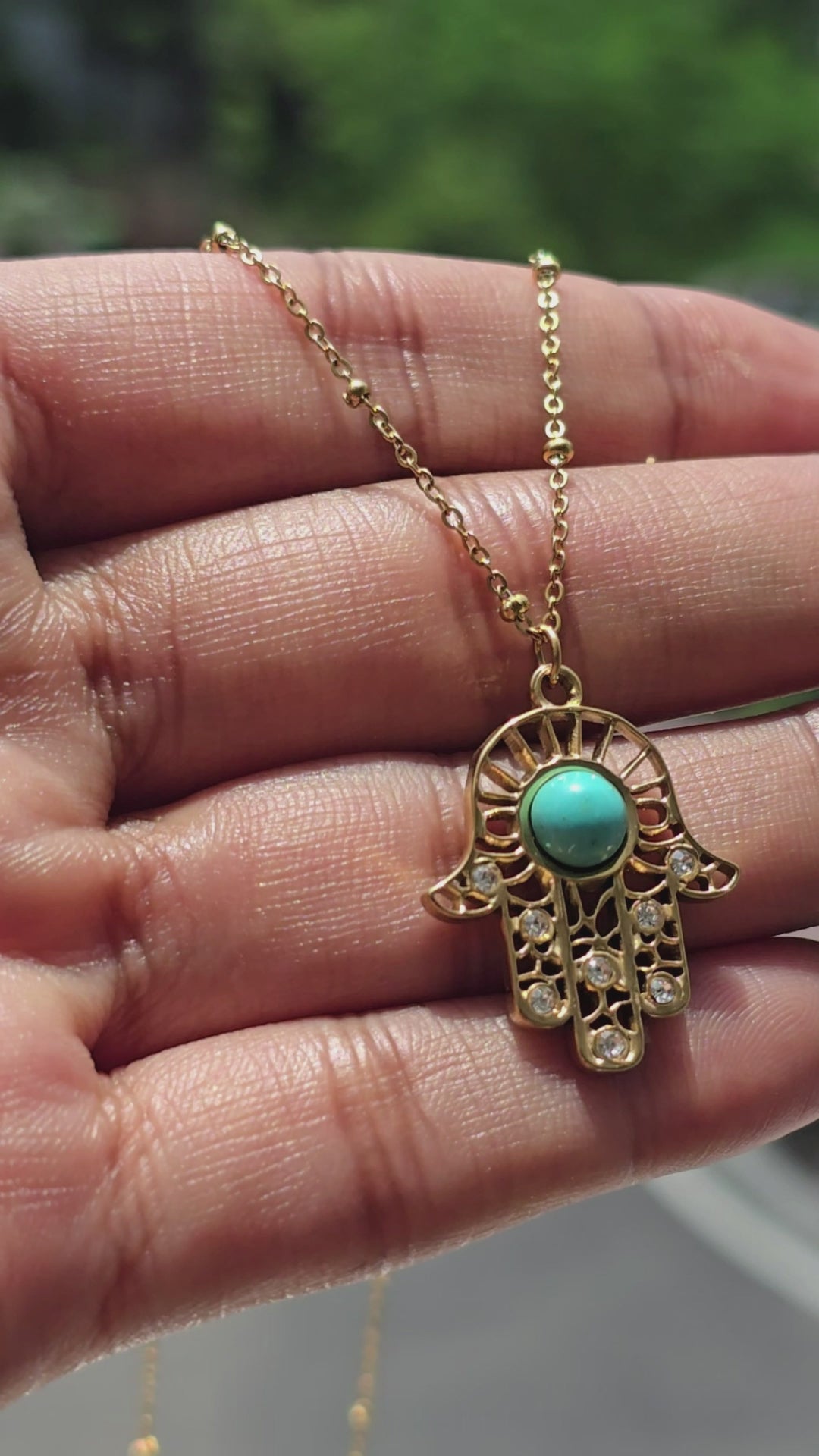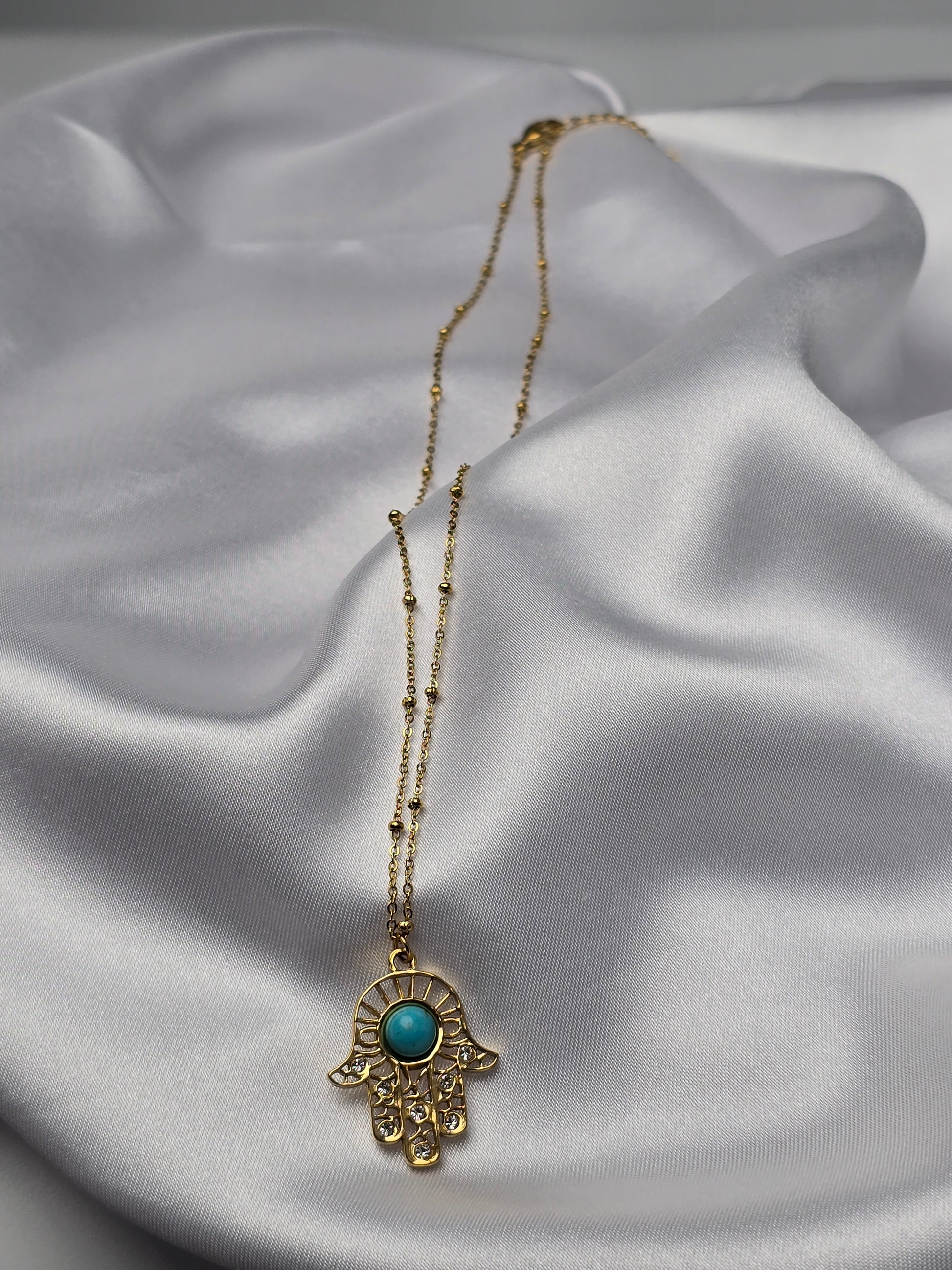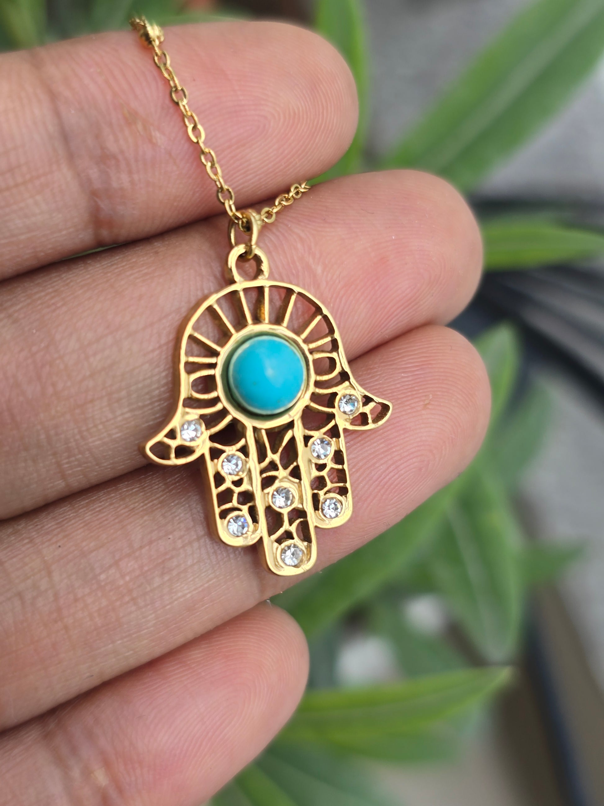 A fusion of spiritual protection and contemporary design, this intricately crafted pendant exudes mystique and meaning.