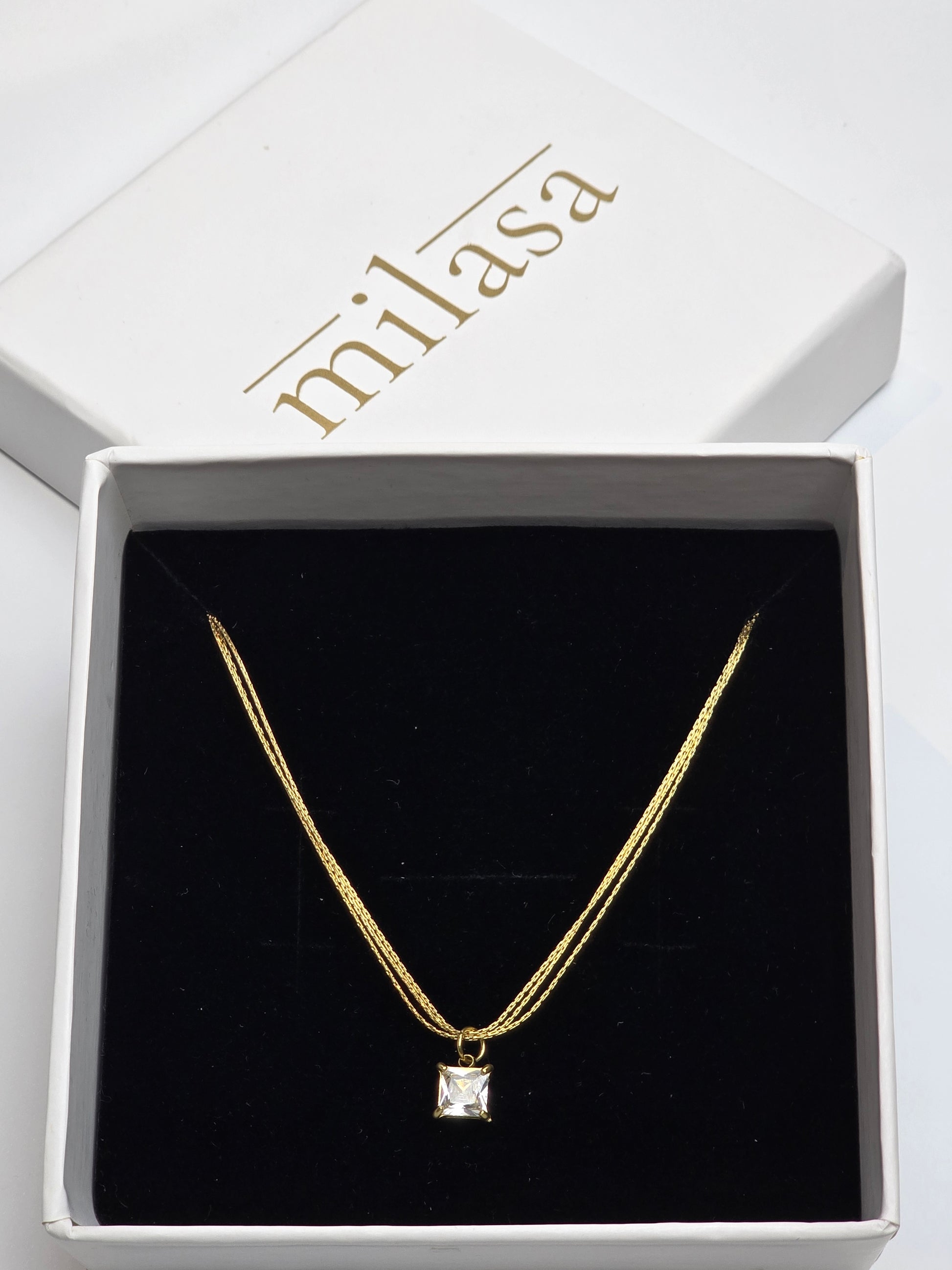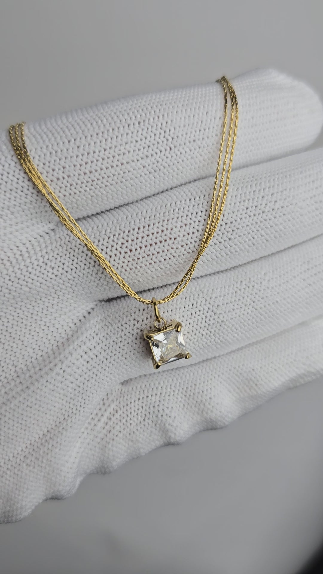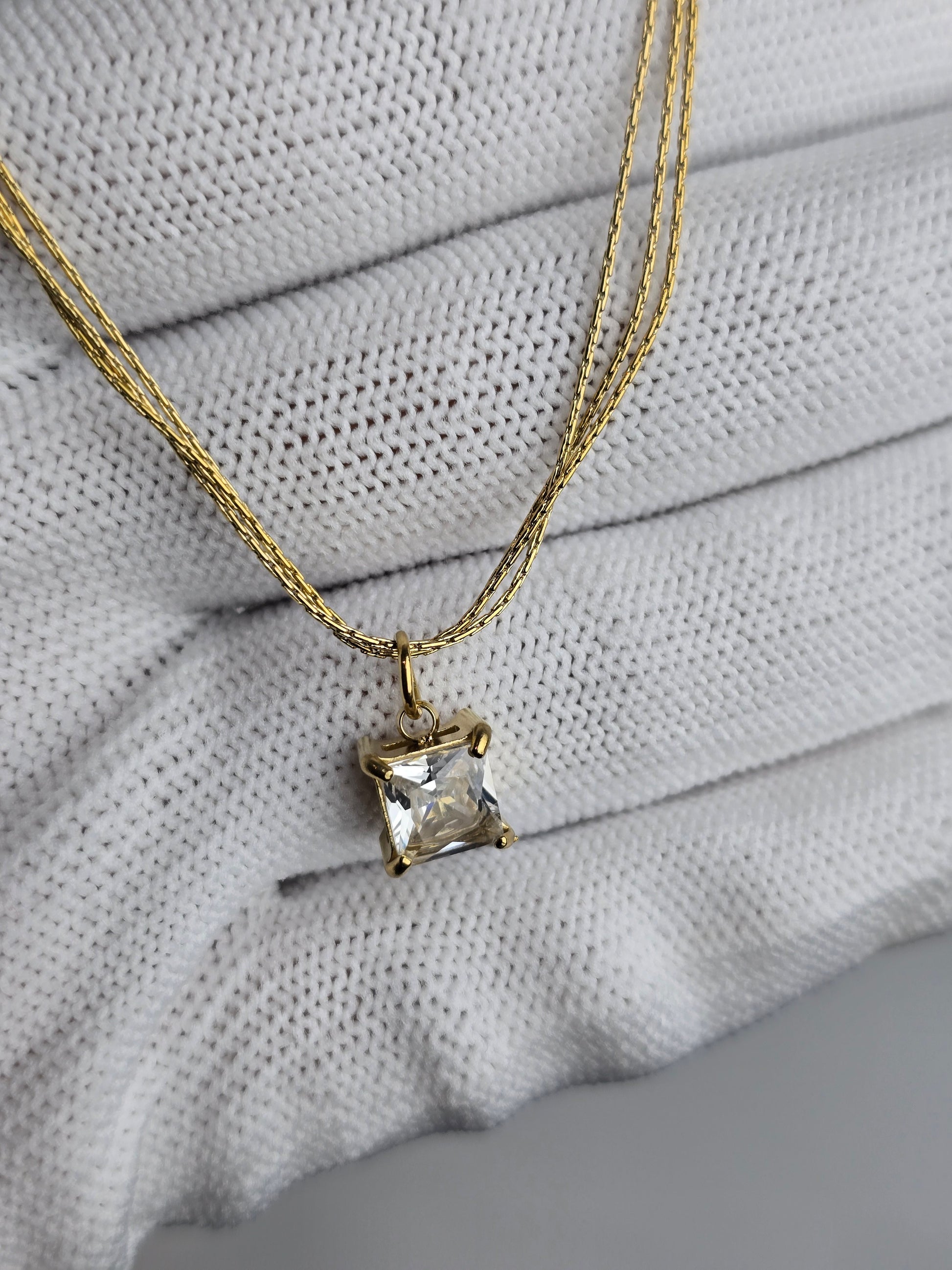 Three fine chains meet at a single square-cut solitaire, giving this necklace a modern layered look with a clean, timeless sparkle.