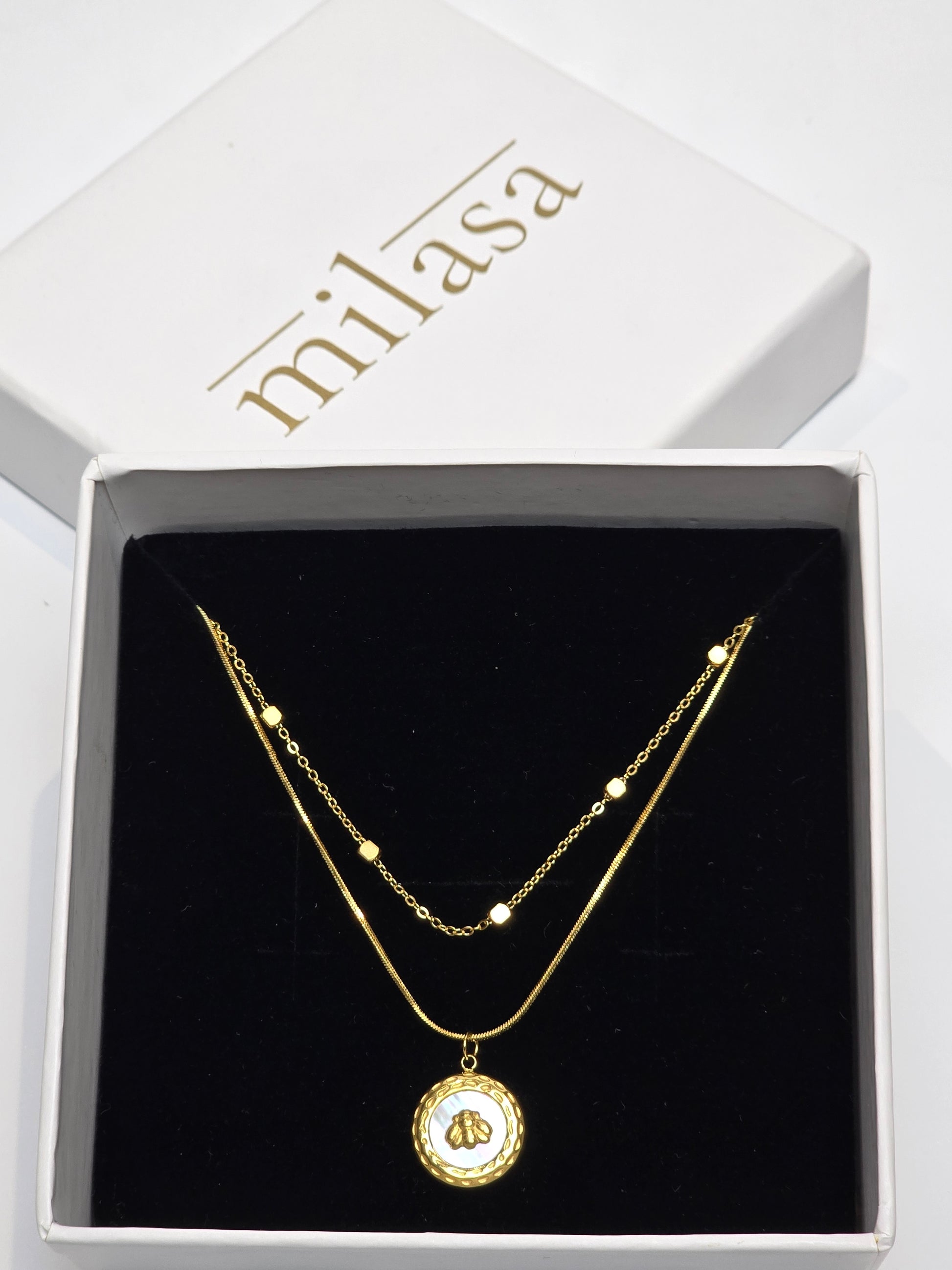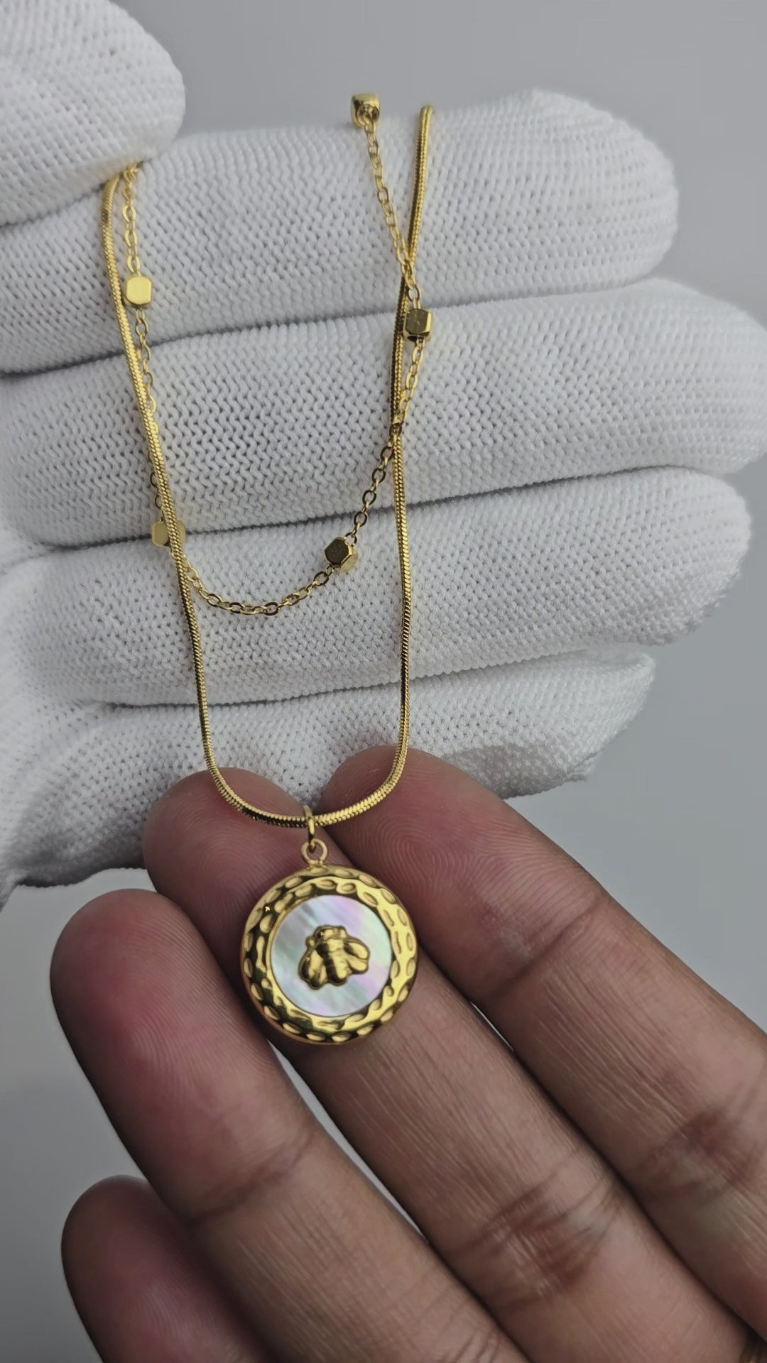 A chic two-layer necklace featuring a dainty bee medallion and fine textured chains. Light and easy to wear, it adds just the right touch of charm to everyday looks.
