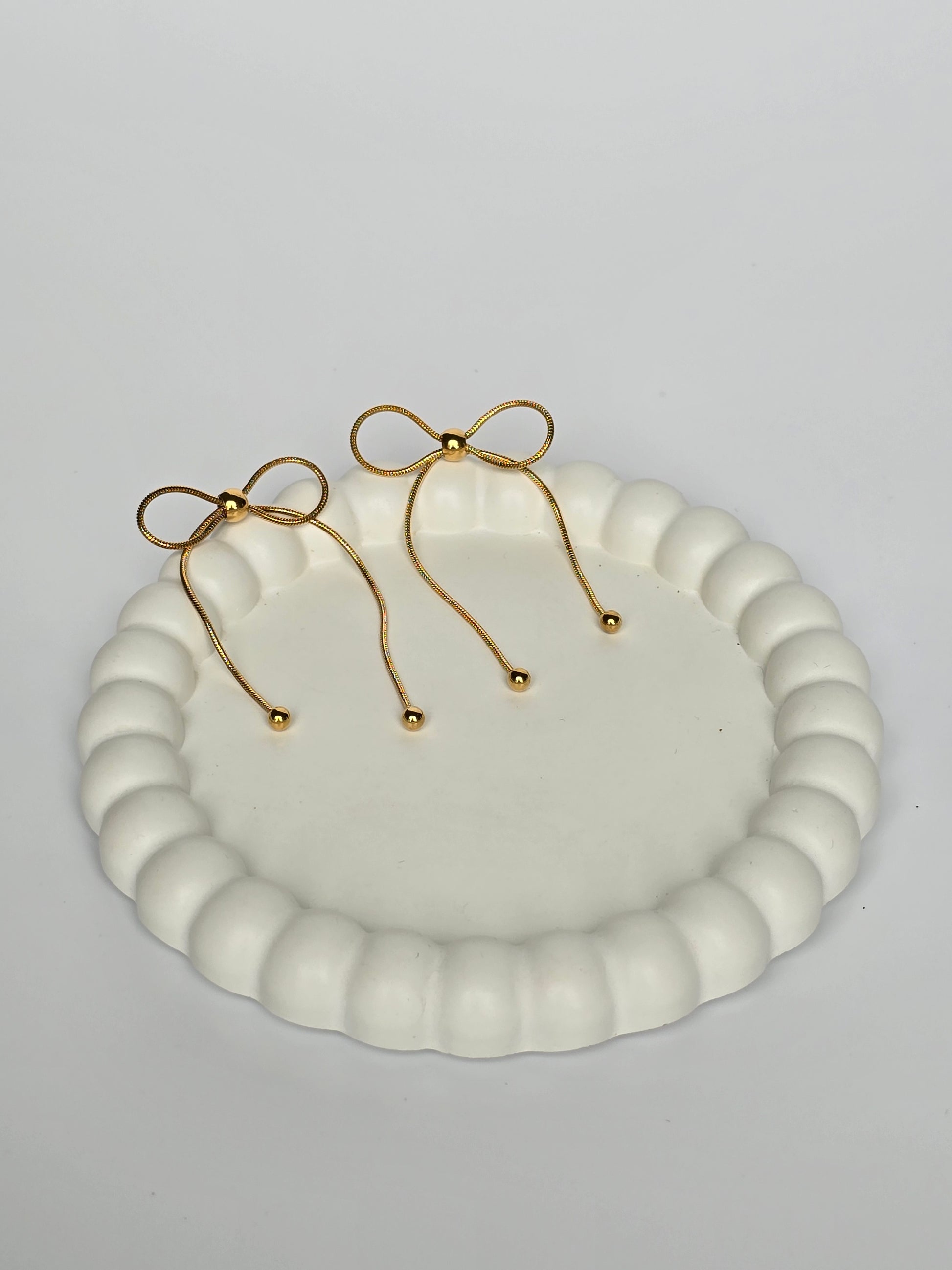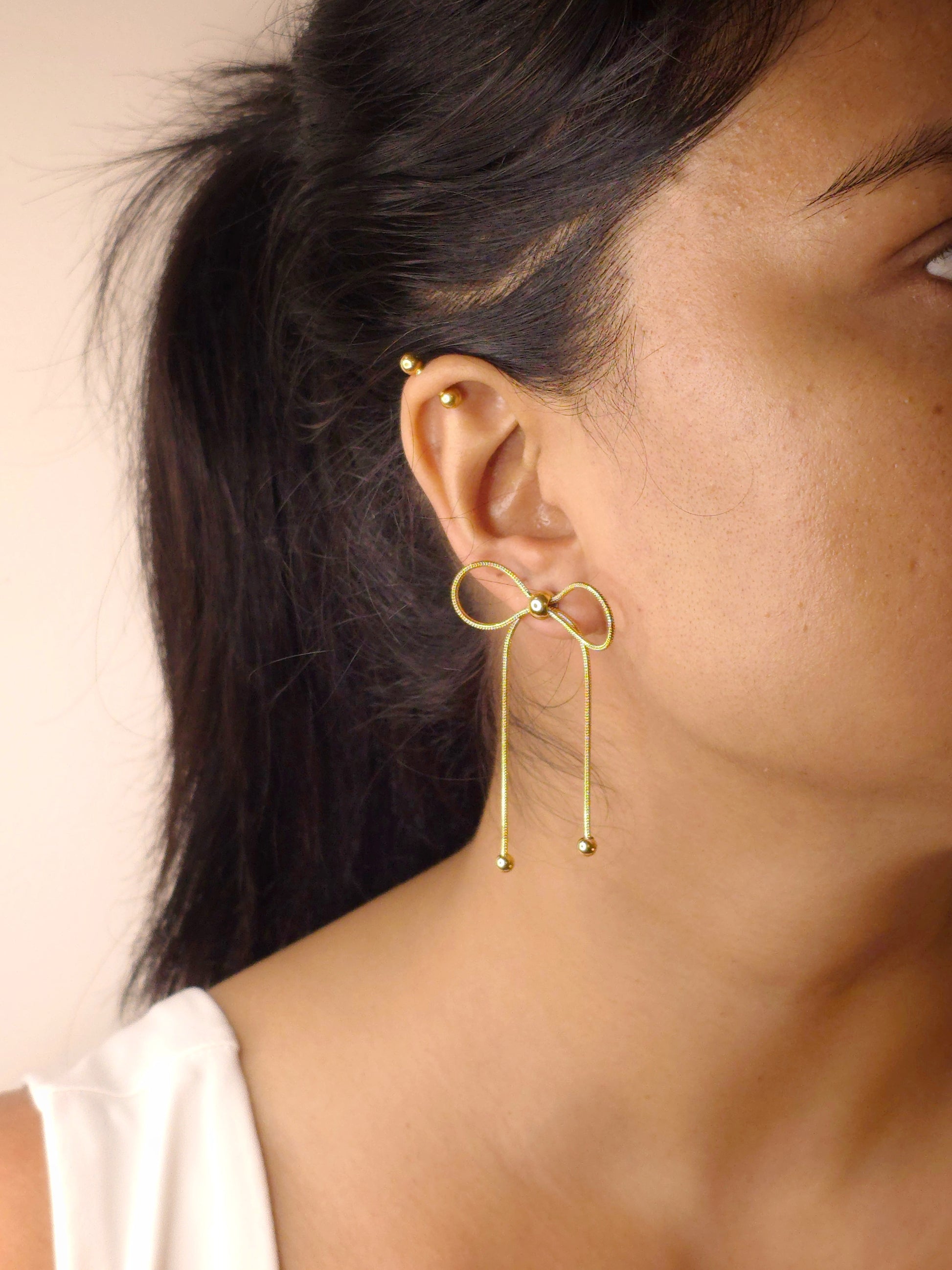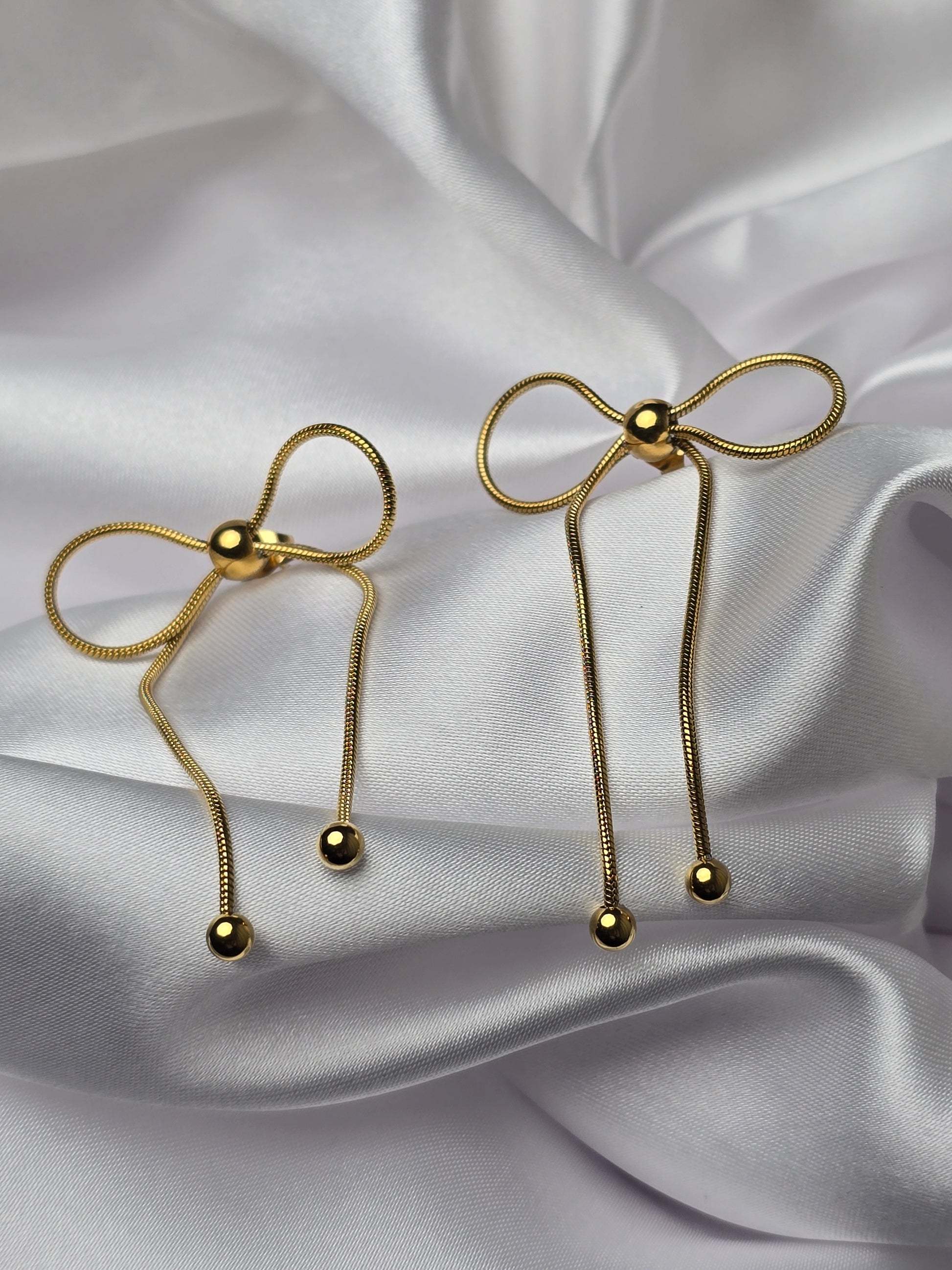 Playful yet polished — these delicate bow earrings feature sleek snake-chain drops ending in golden spheres. Lightweight, feminine, and full of charm.