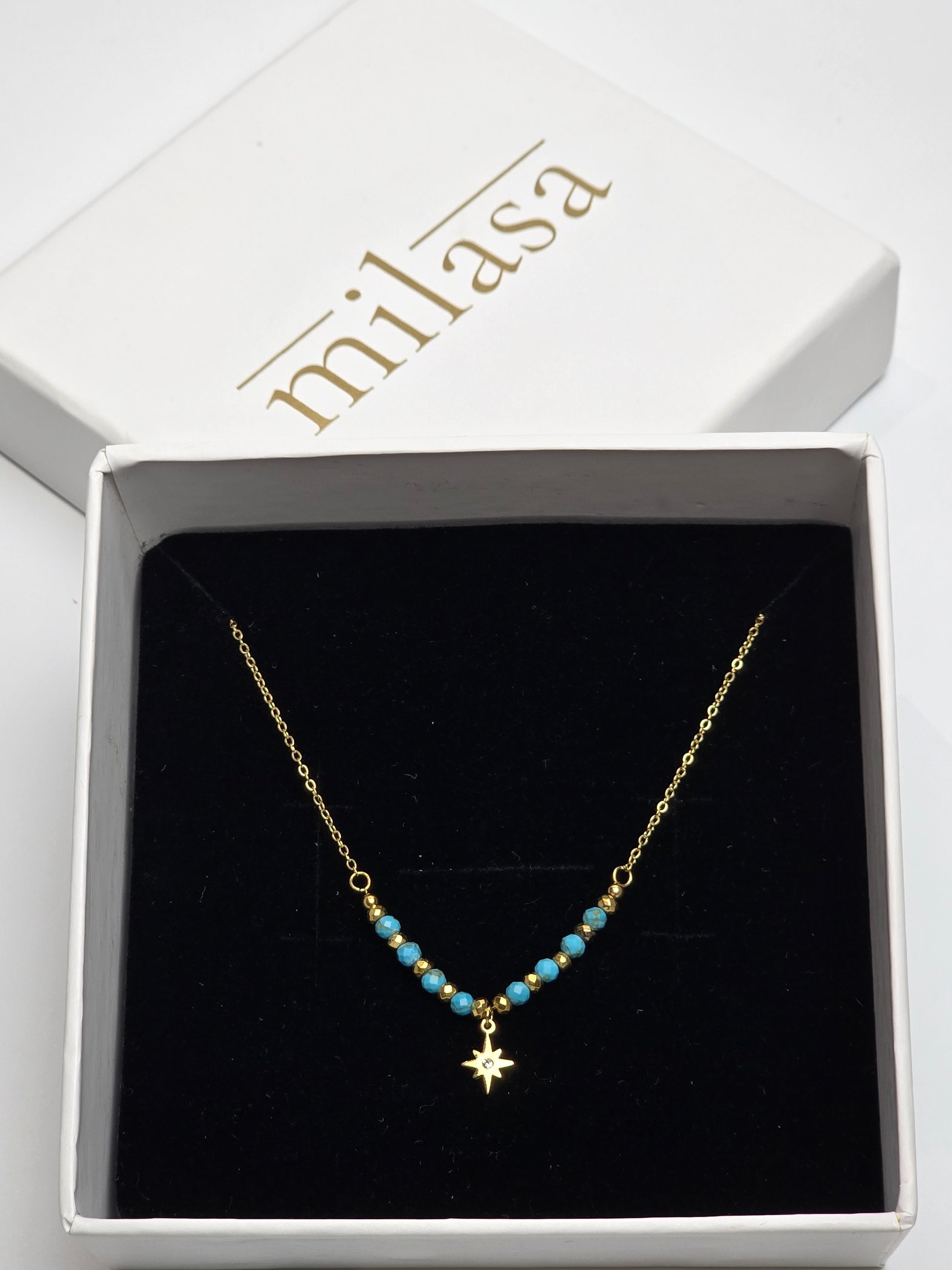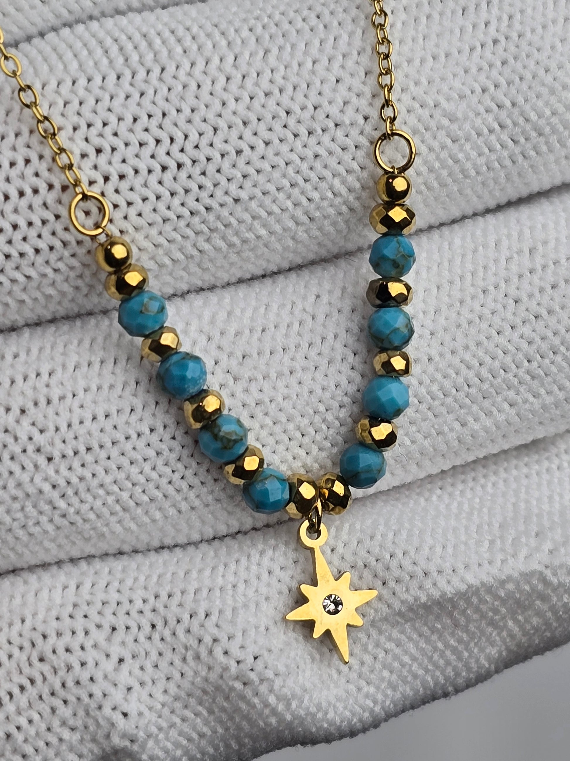Cool turquoise beads paired with a golden star charm create a breezy, boho-inspired piece. Light, versatile, and wanderlust-ready, it’s perfect for both everyday wear and getaways.