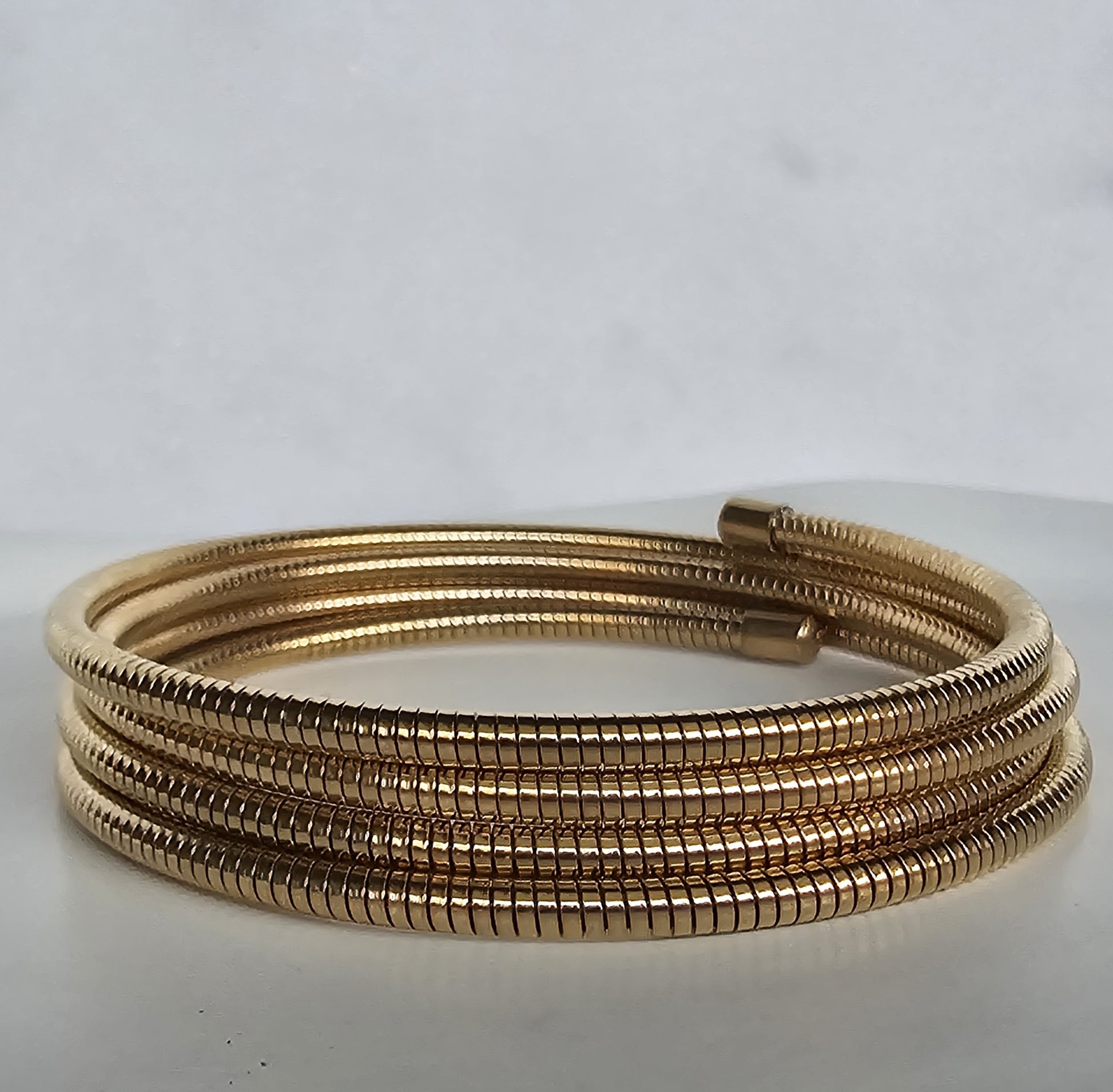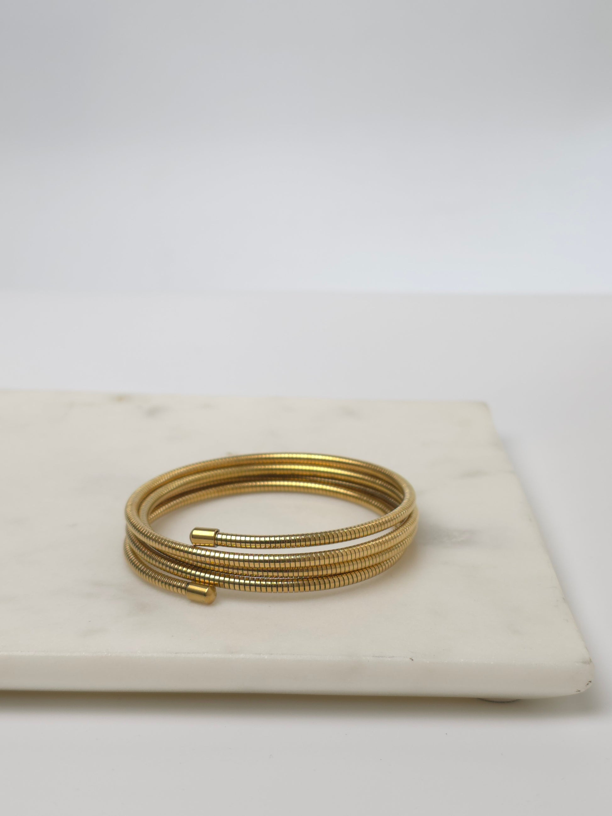 Bold, coiled bracelet that wraps gracefully around the wrist, making a statement.