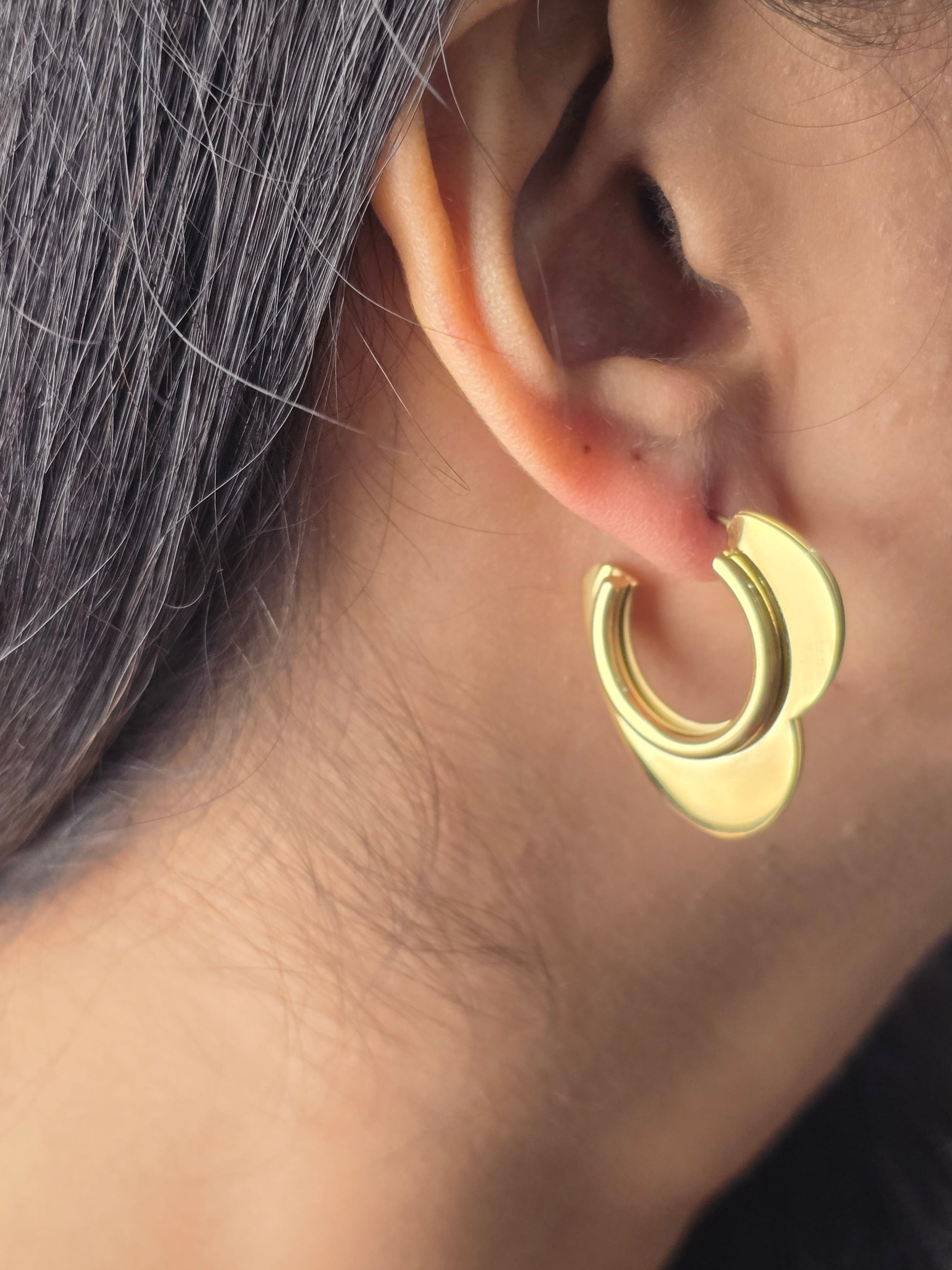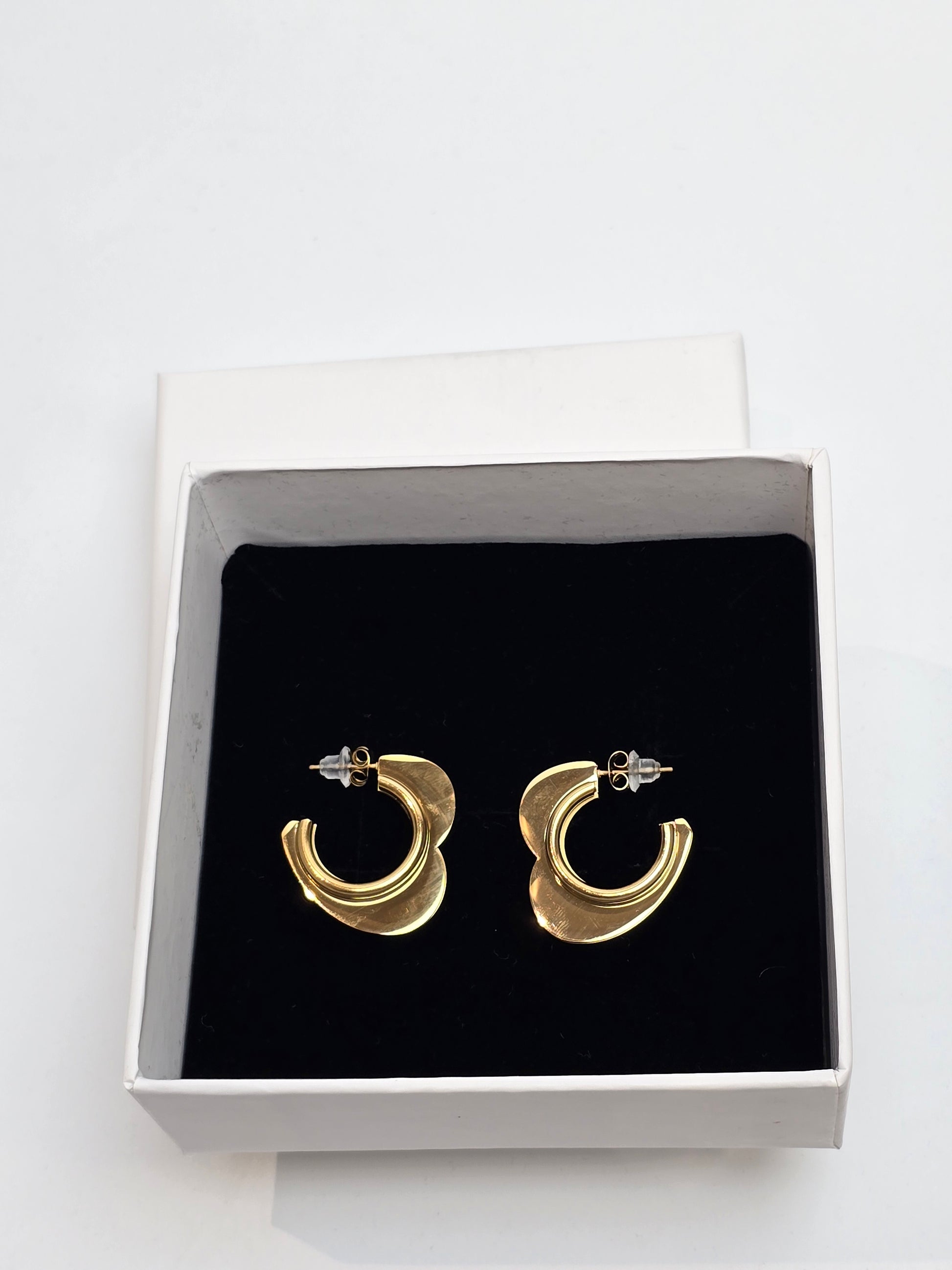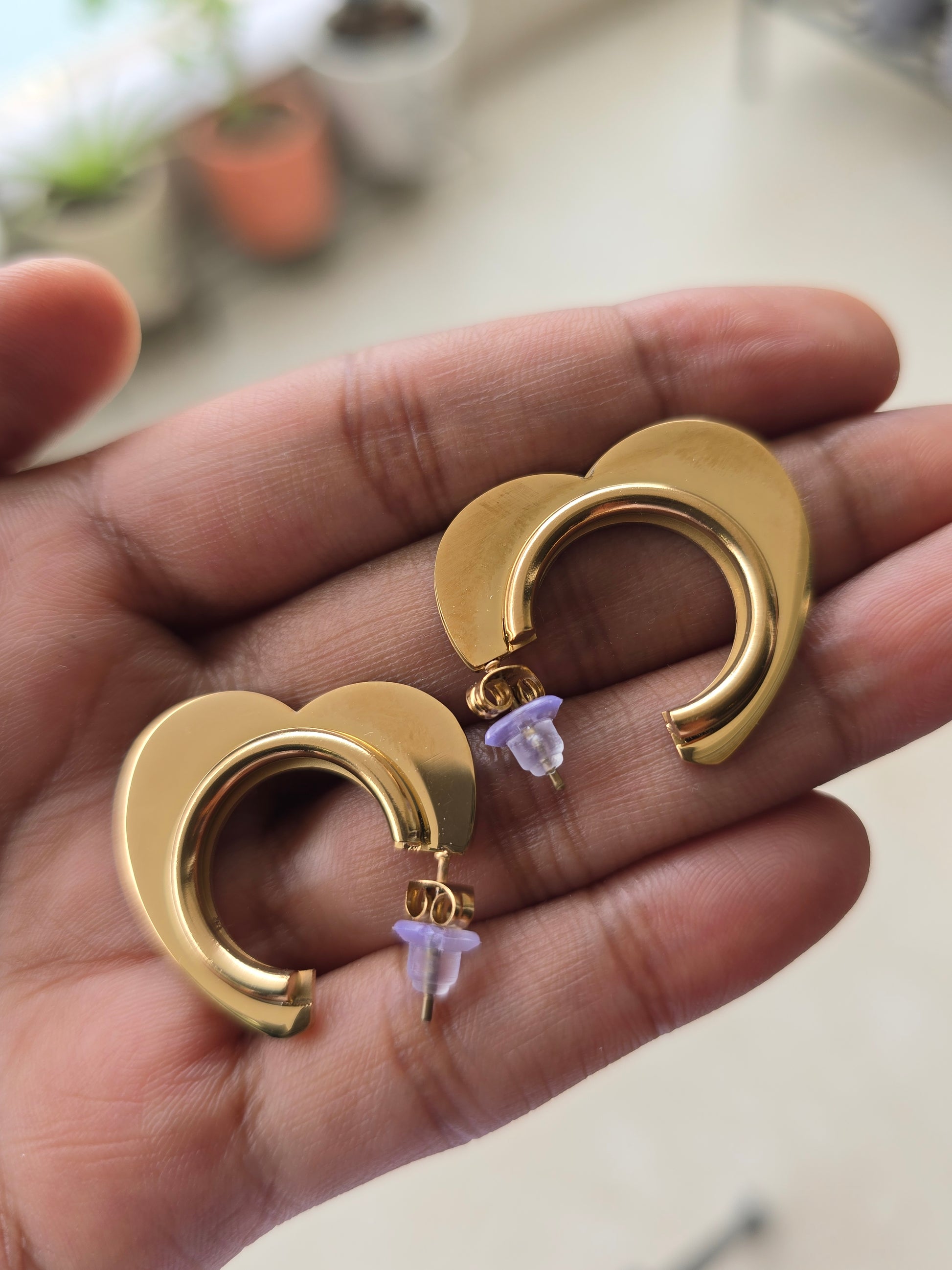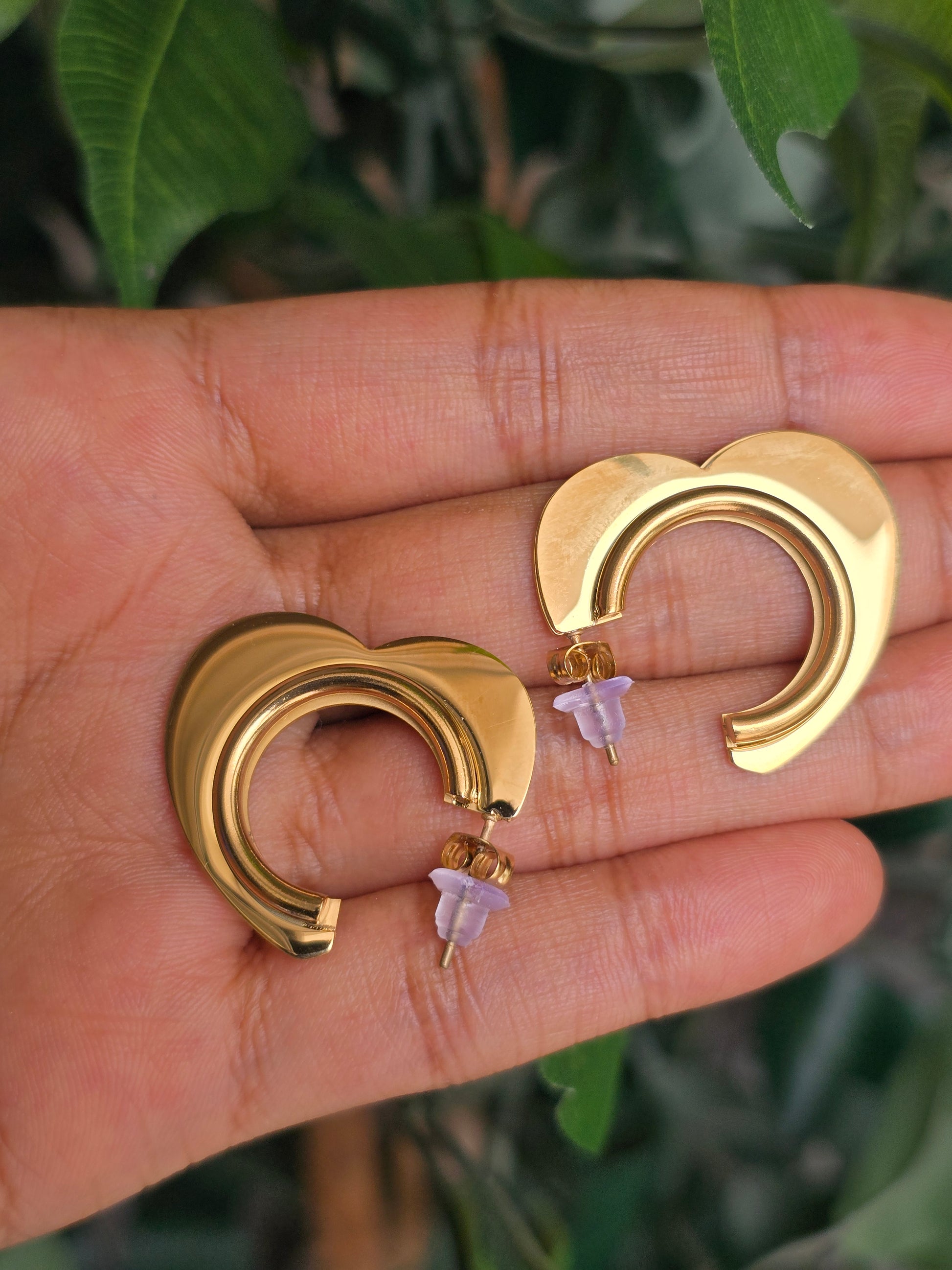 A refined take on romance. These modern arc hoops blend a circular base with a delicate half-heart cutout, creating an elegant yet playful statement. Designed in durable, hypoallergenic stainless steel for all-day wear.
