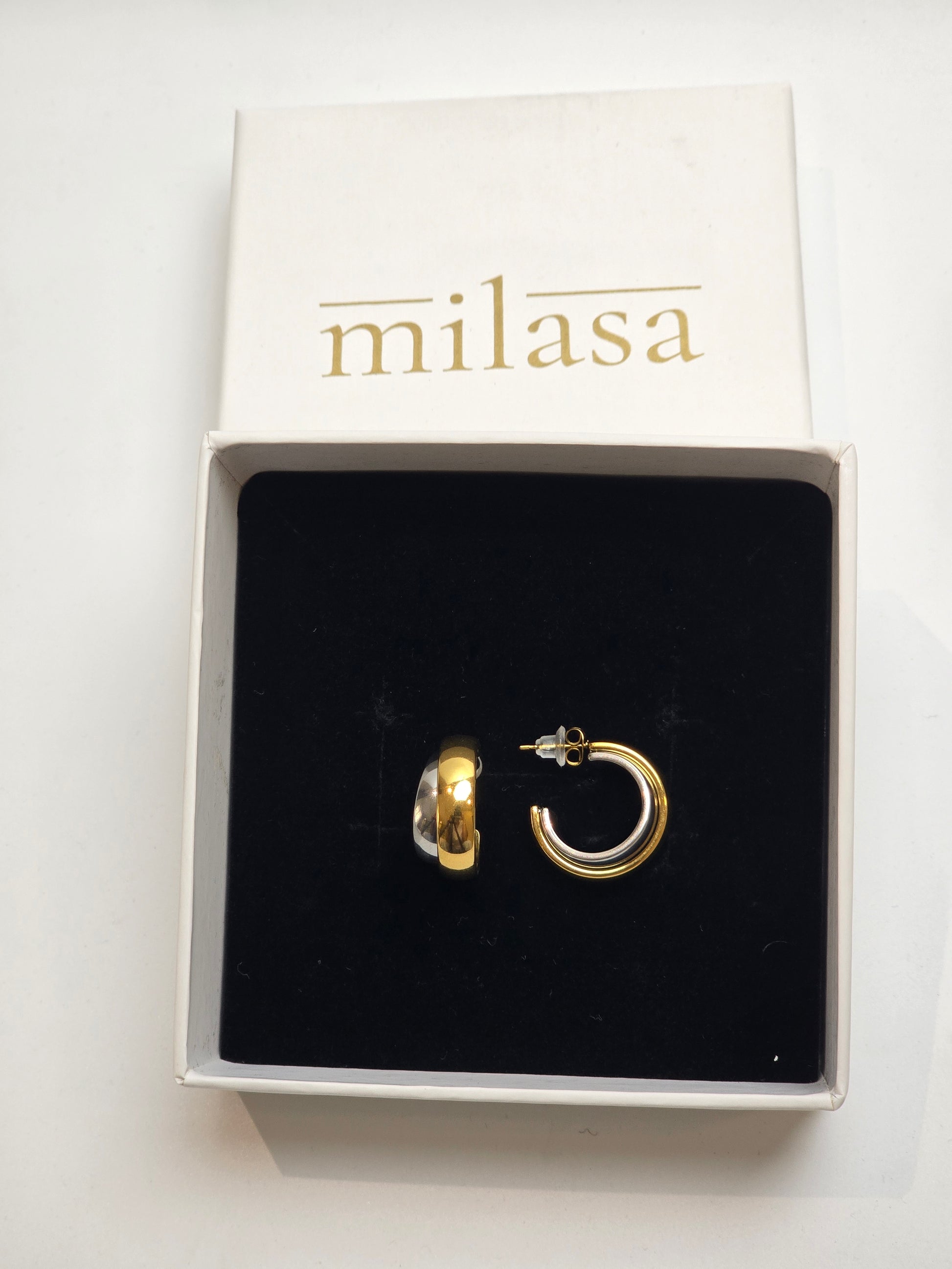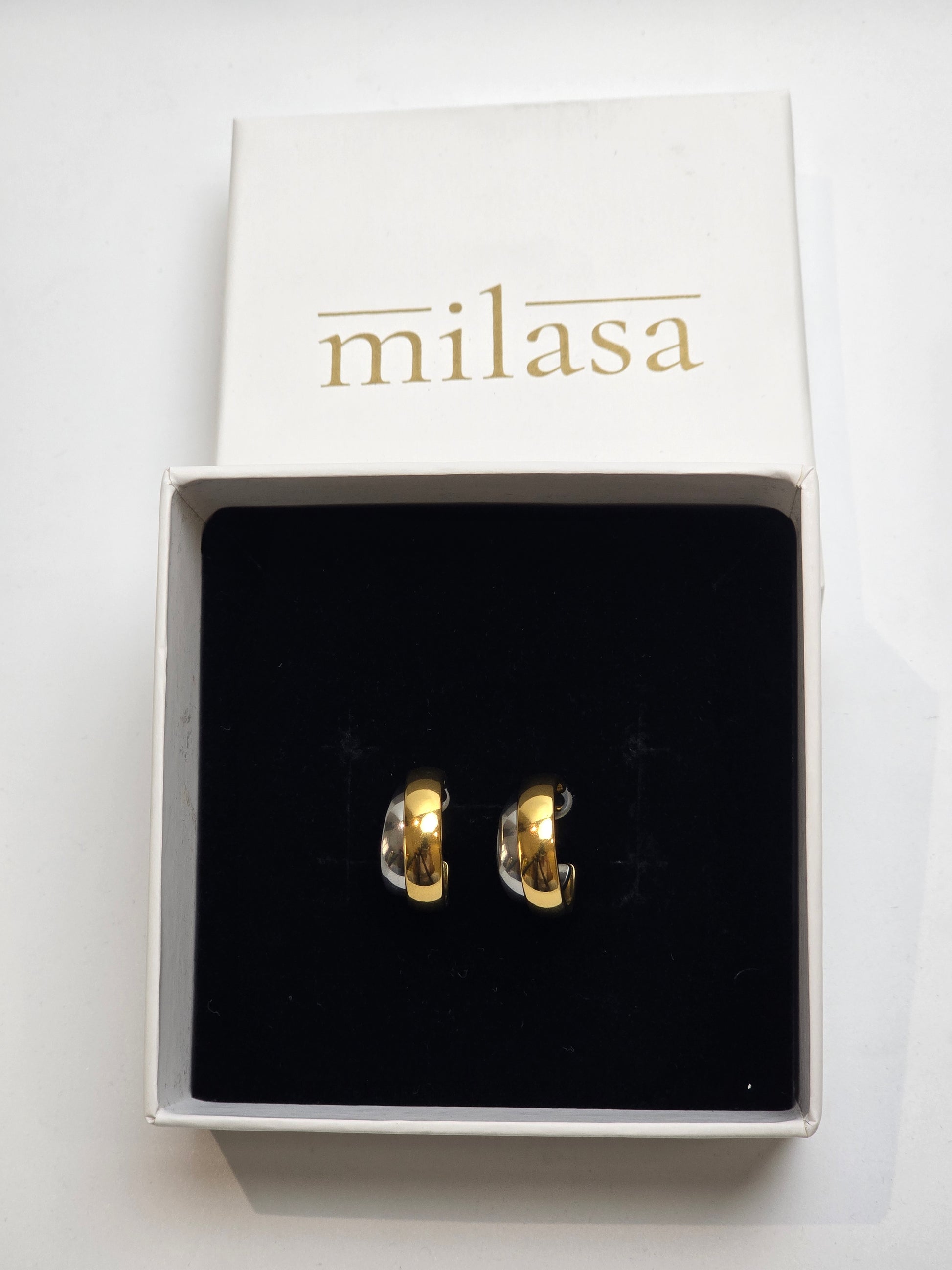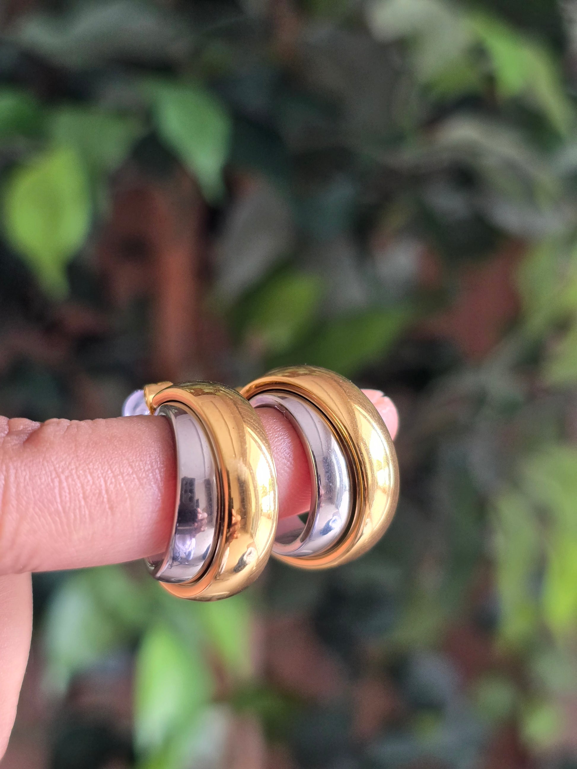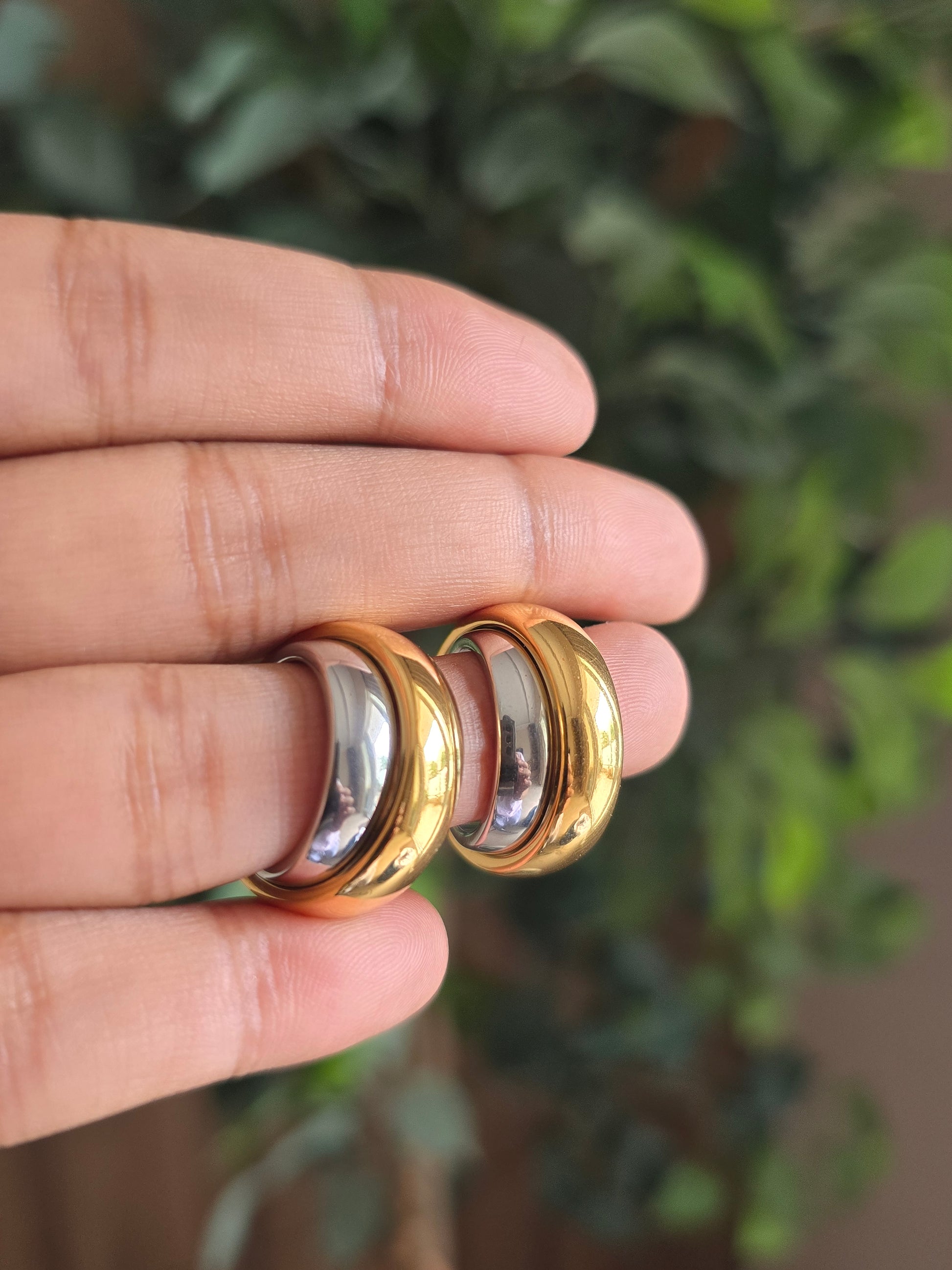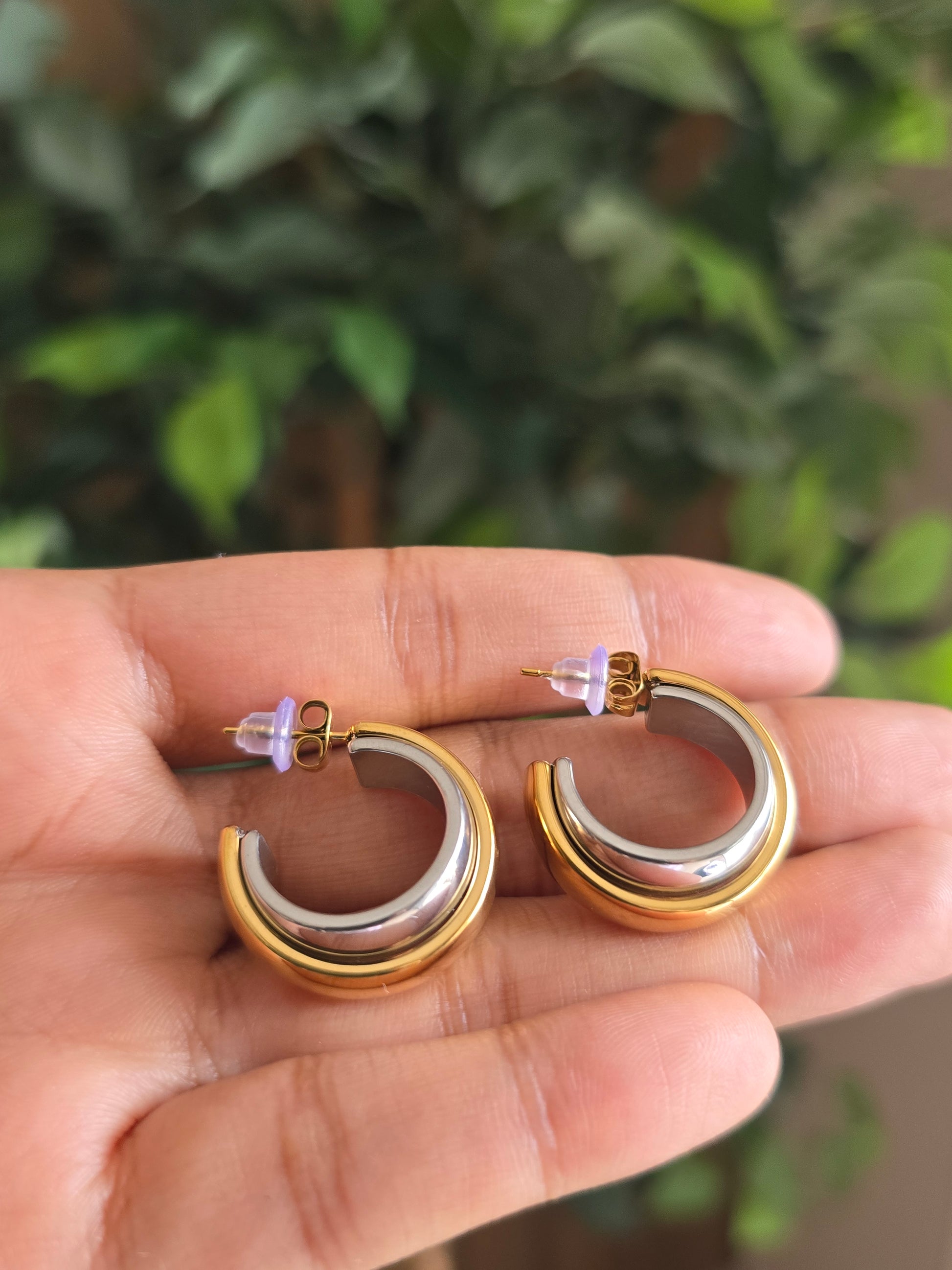 A seamless fusion of contrast and elegance. These open hoops feature a polished gold exterior and a sleek silver interior, creating a versatile piece that pairs effortlessly with mixed-metal jewelry. Crafted in tarnish-resistant stainless steel for enduring beauty.