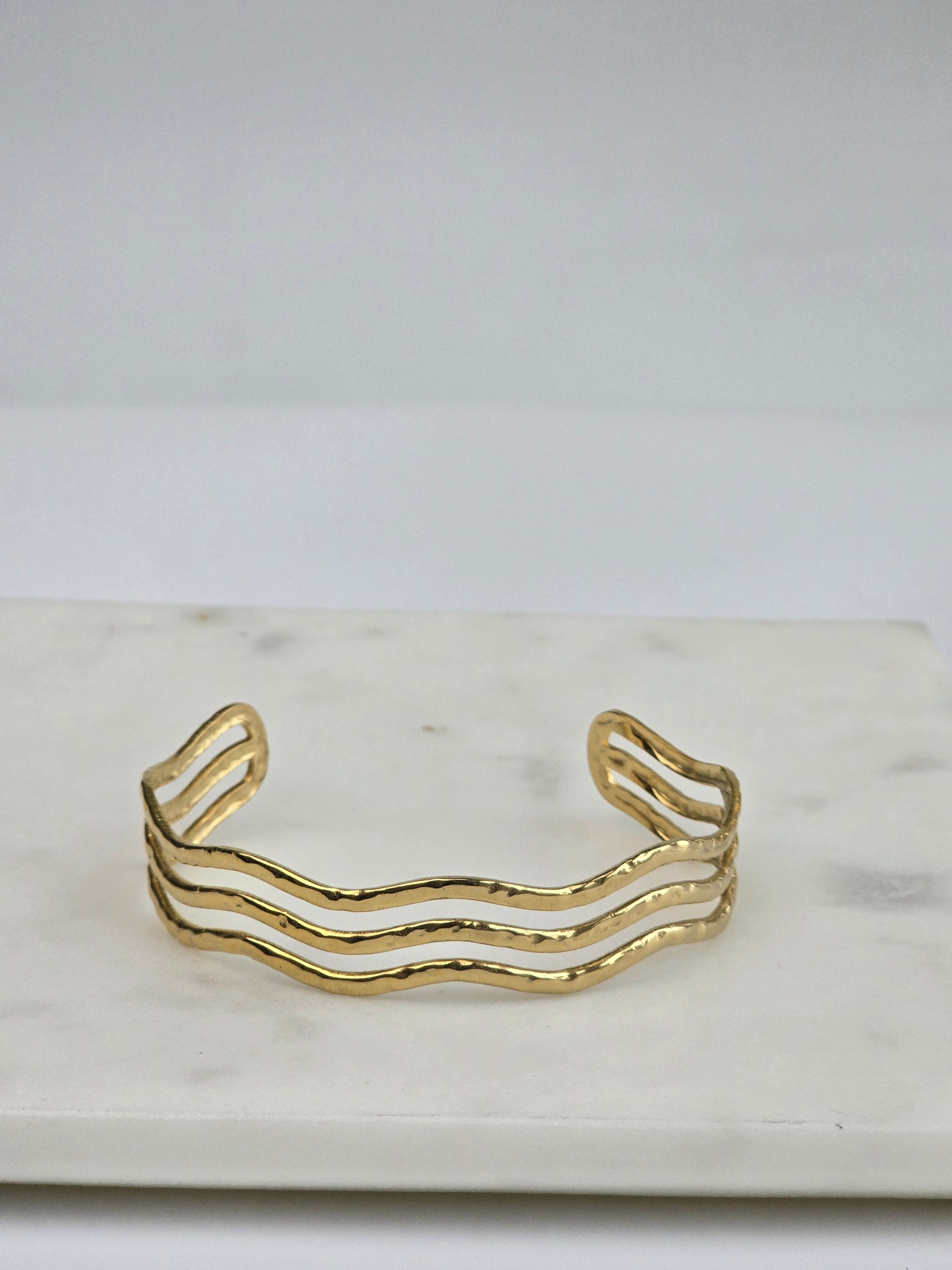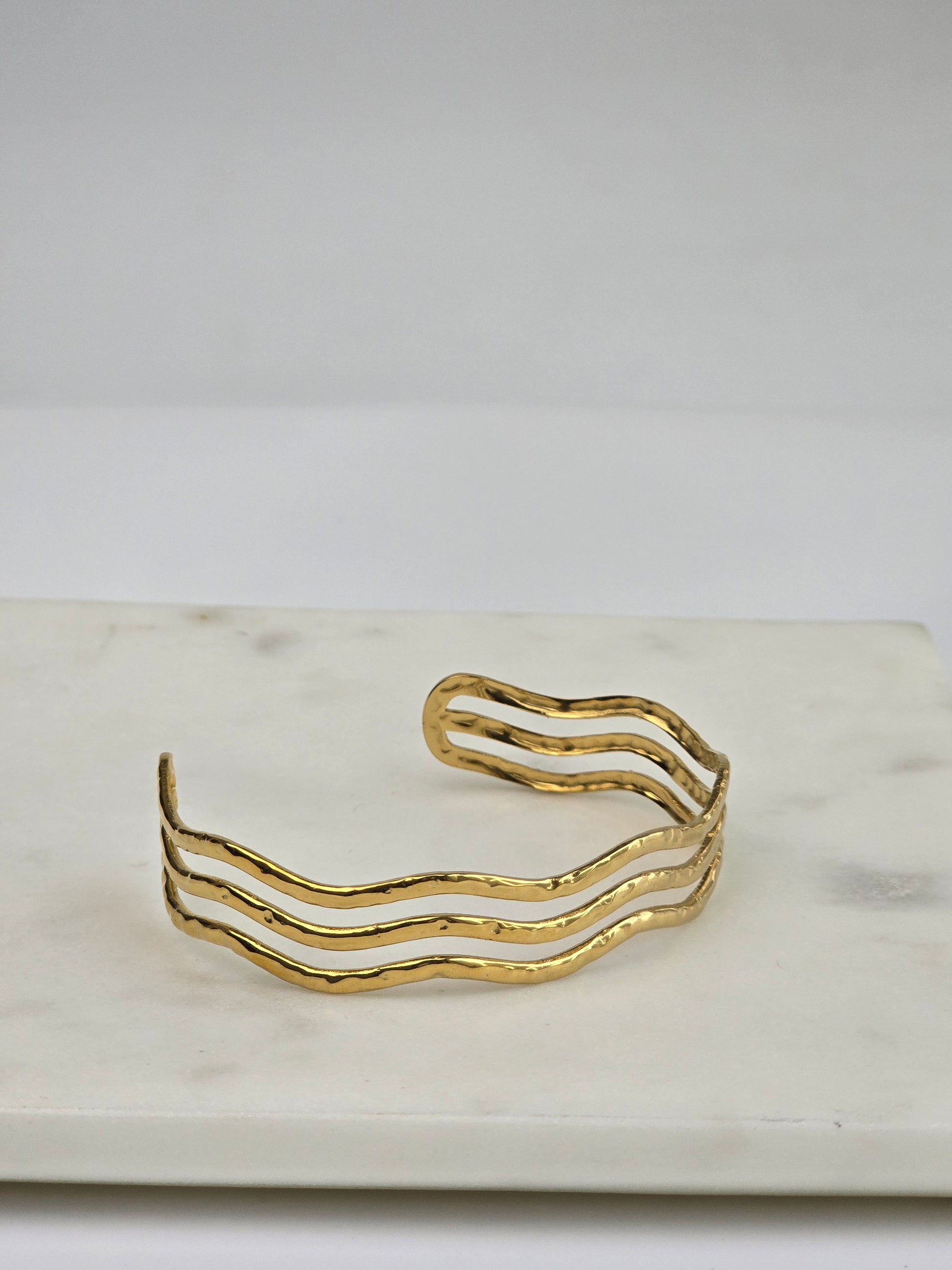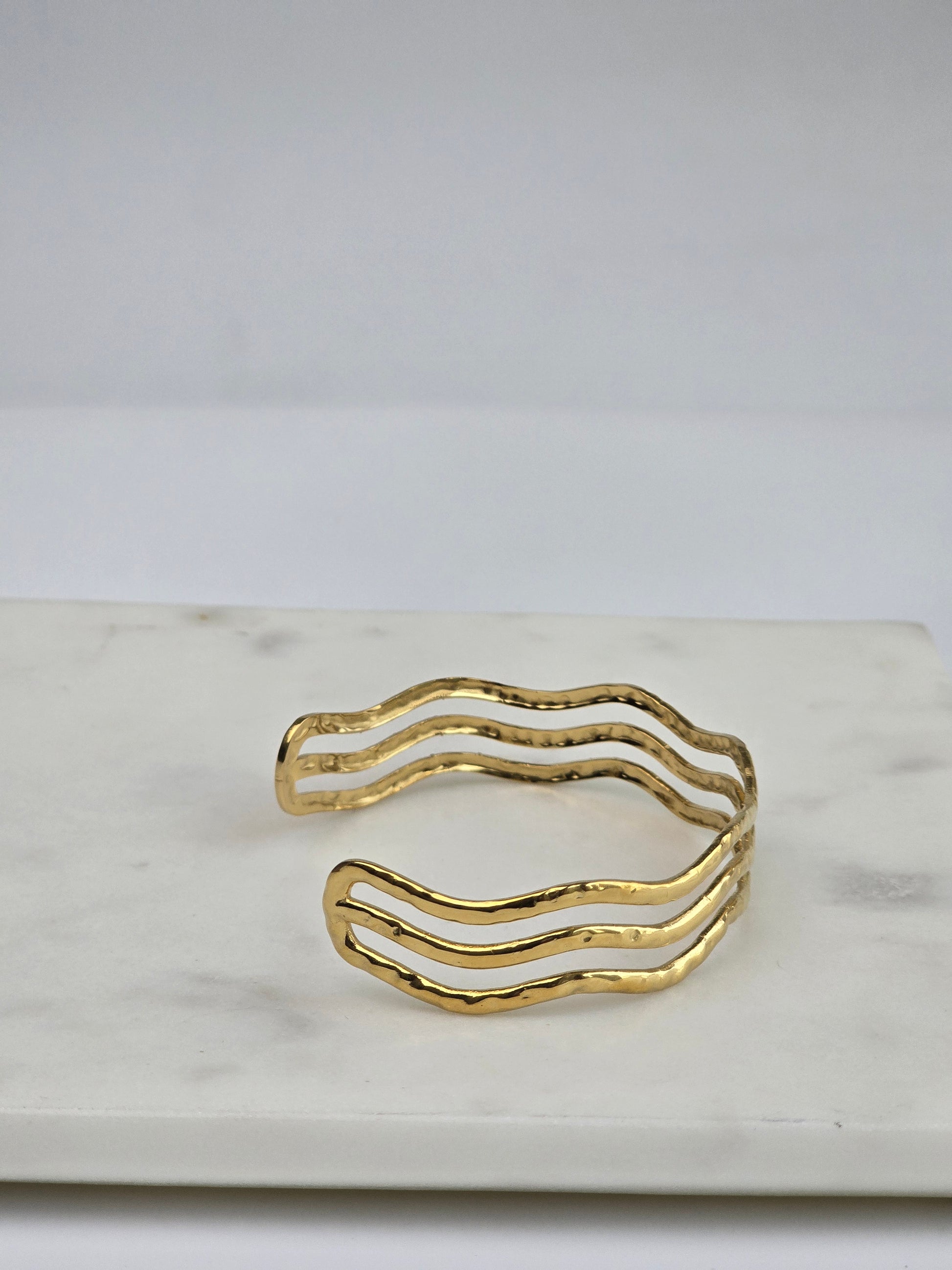 Three fluid, rippling gold bands sculpted into a single open cuff — bold yet wearable, inspired by ocean tides.
