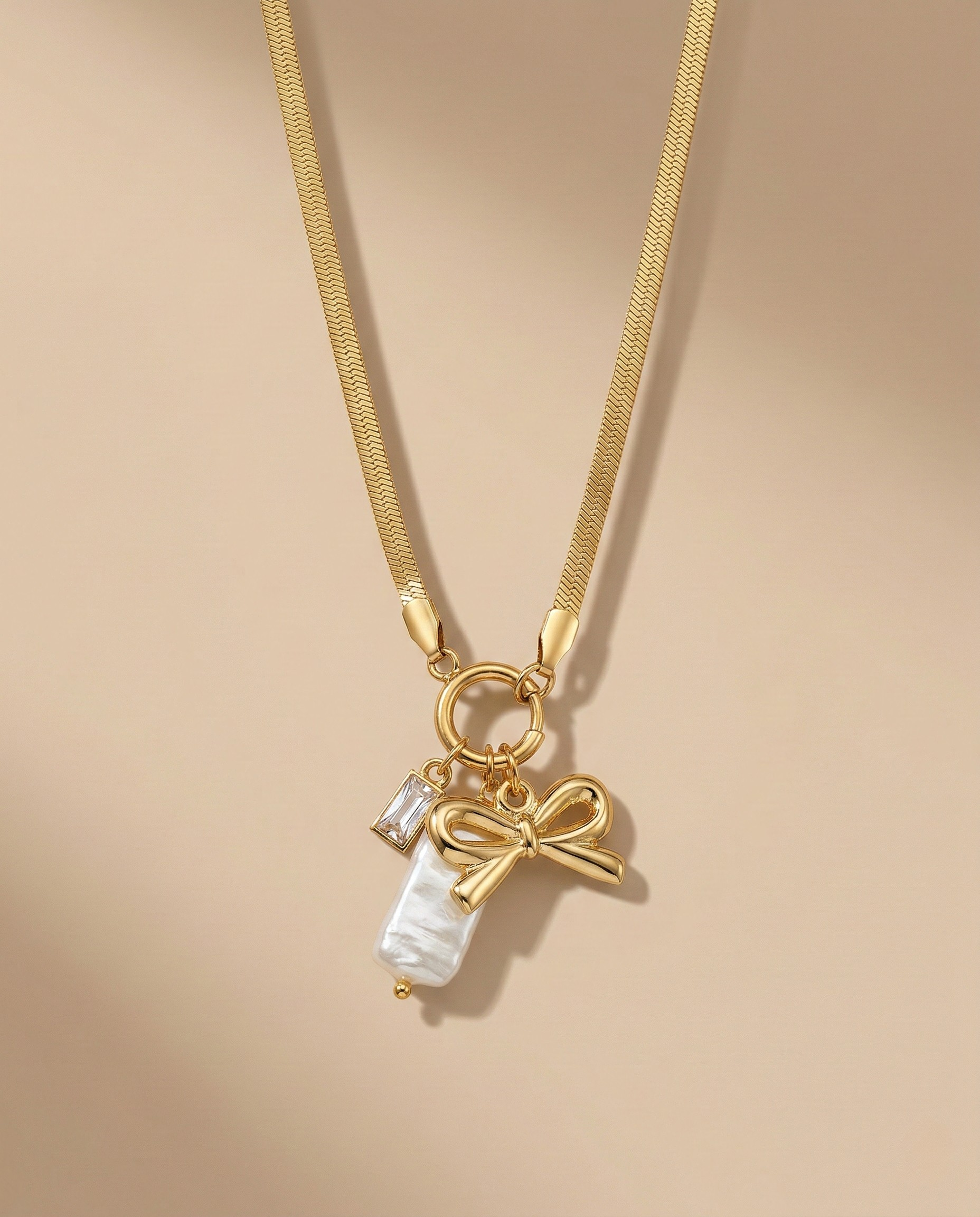 Sleek and sophisticated, this snake chain necklace showcases a sculpted bow, a luminous elongated pearl, and a rectangular zirconia charm. A graceful blend of elegance and playful charm—designed to complement your holiday wardrobe.