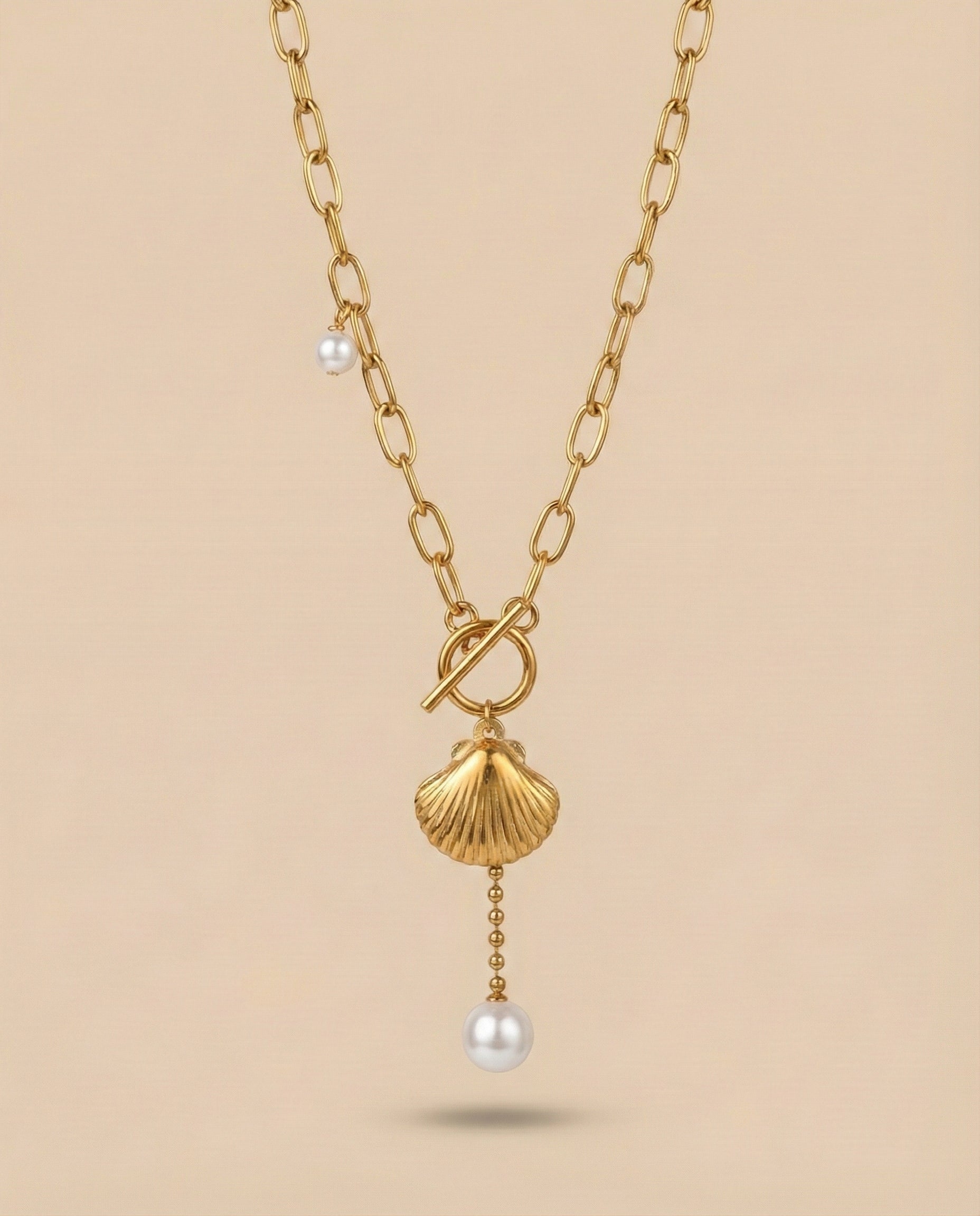 A bold yet graceful piece crafted with an elegant interlinked chain, featuring a sculpted seashell charm and an elongated pearl drop. A refined nod to coastal luxury—perfectly balancing natural beauty with modern design.