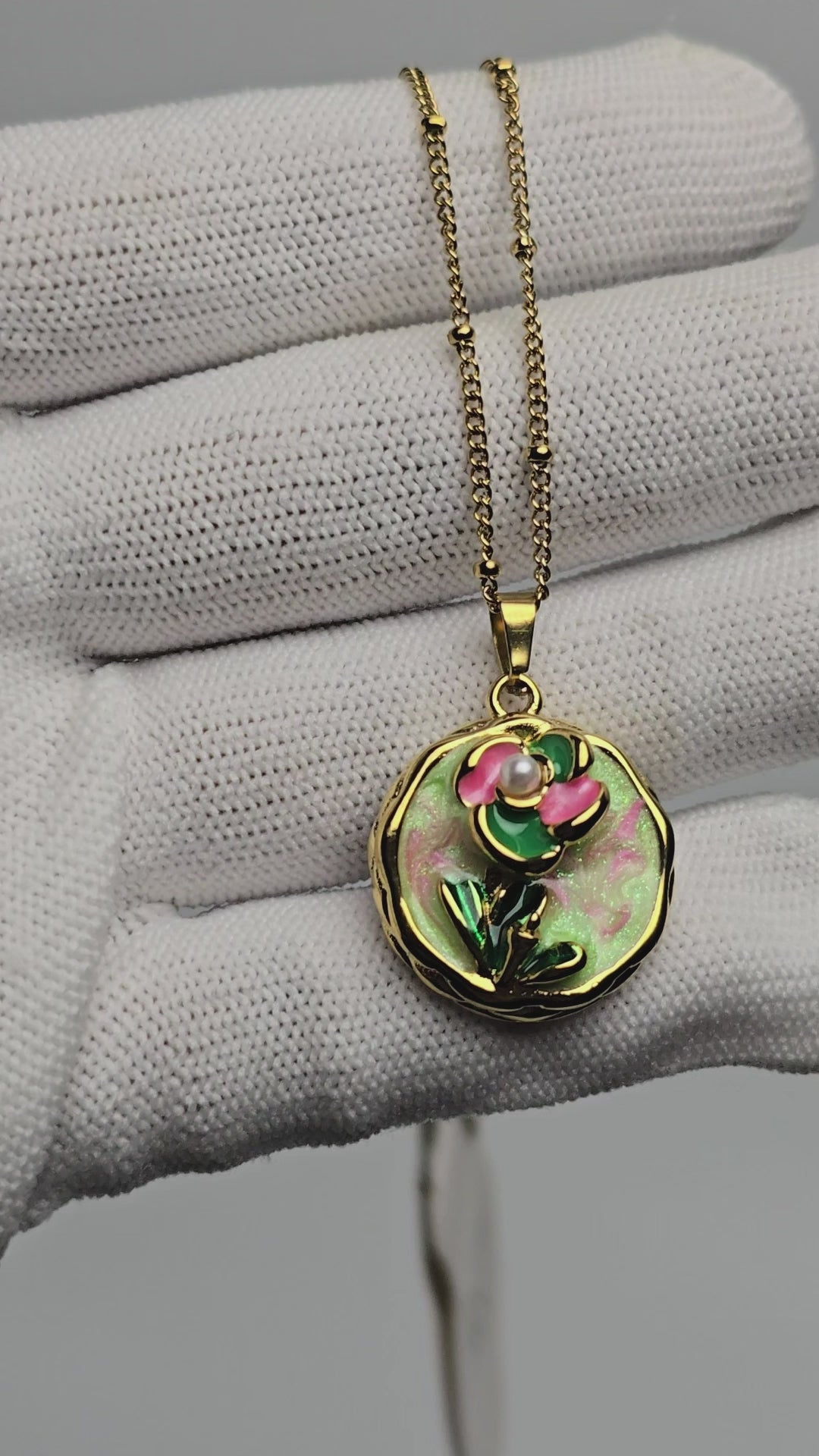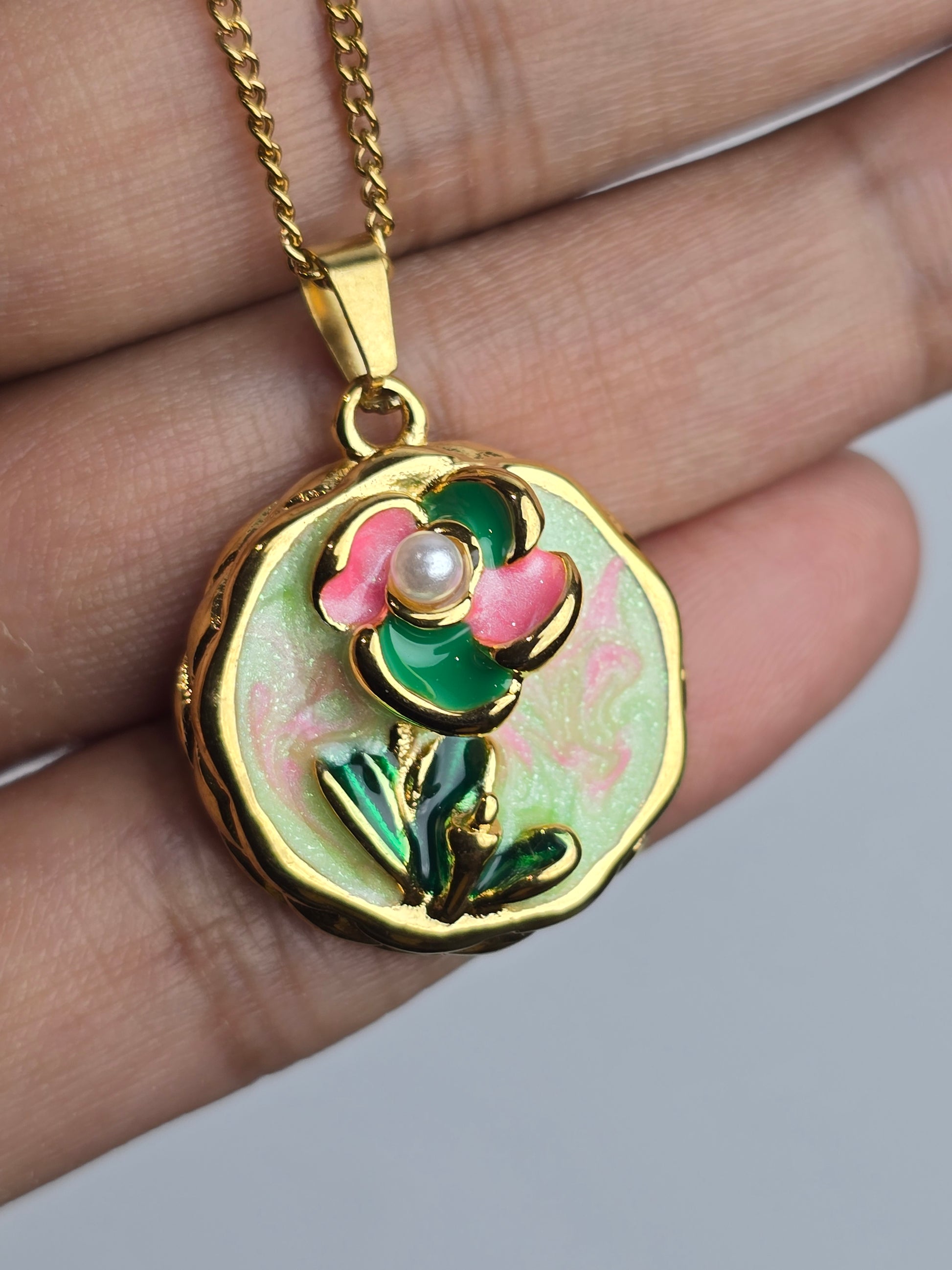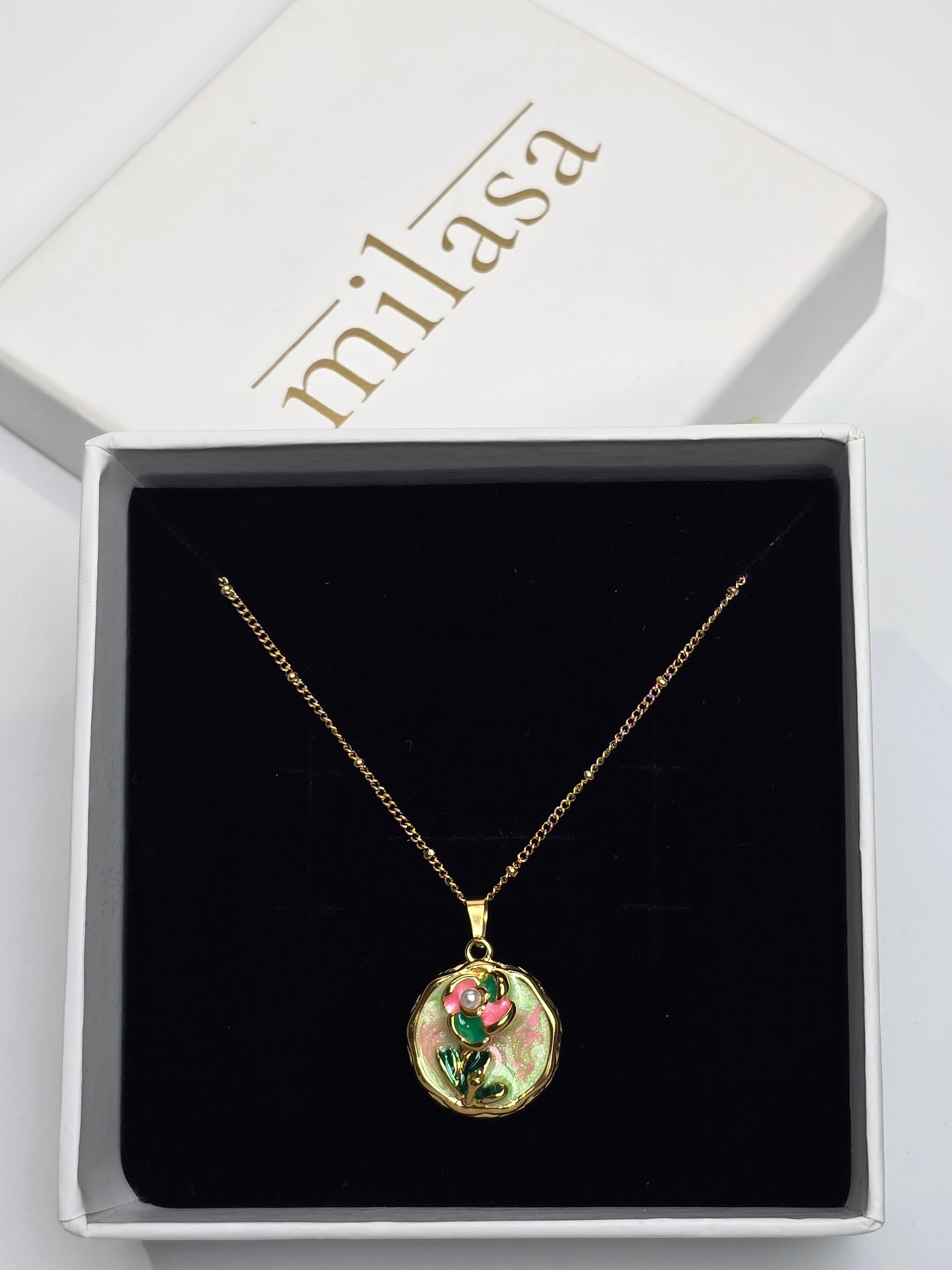 This pendant showcases a pearl-centred bloom framed with fresh green enamel, finished in a high-quality, tarnish-free polish. A vibrant piece that adds subtle luxury to any look.