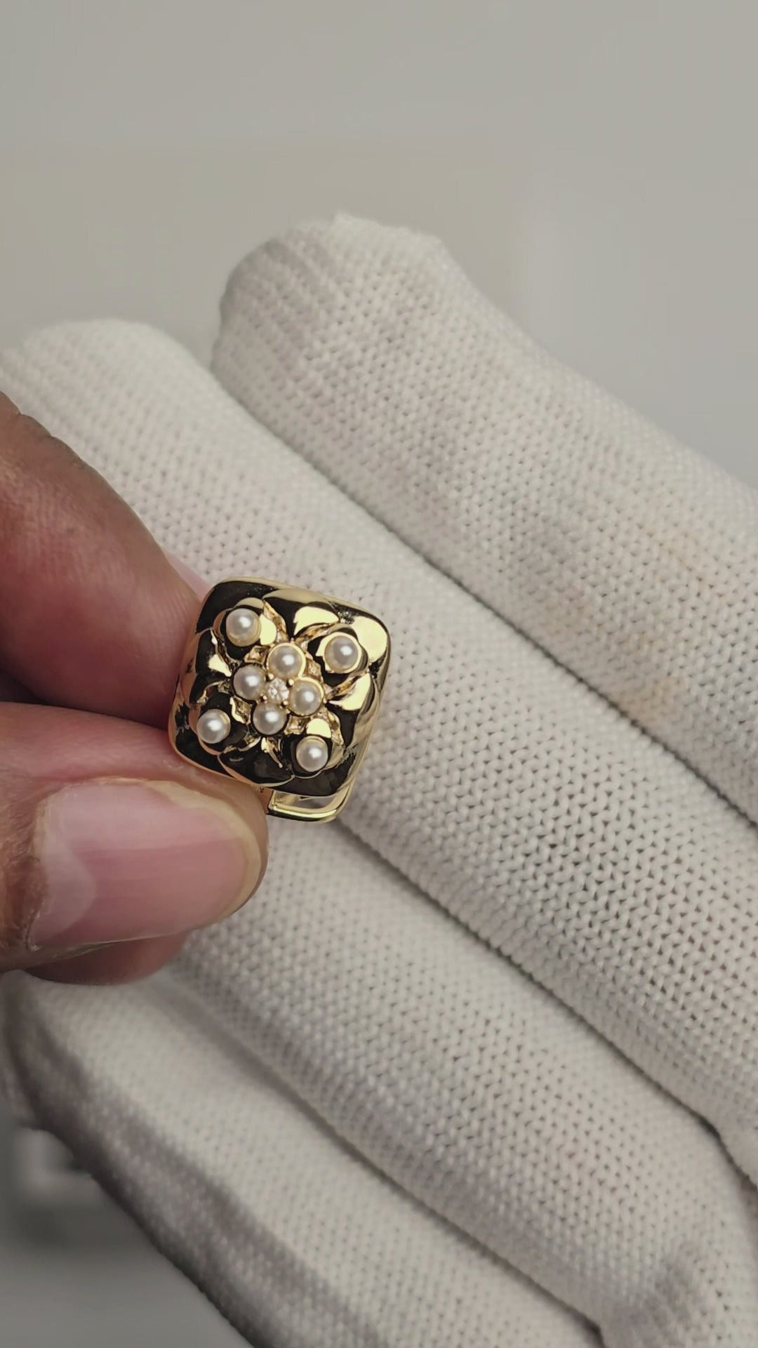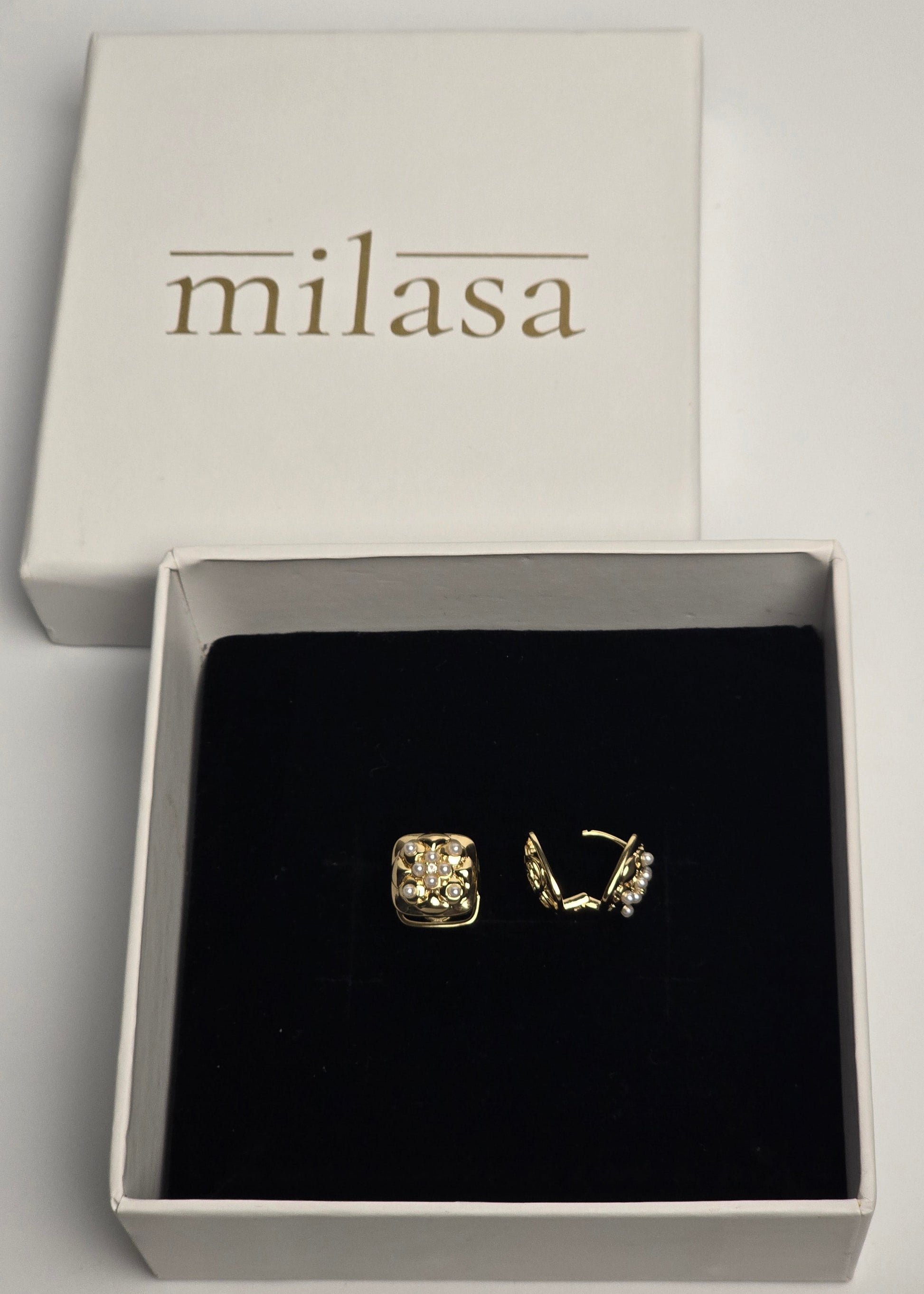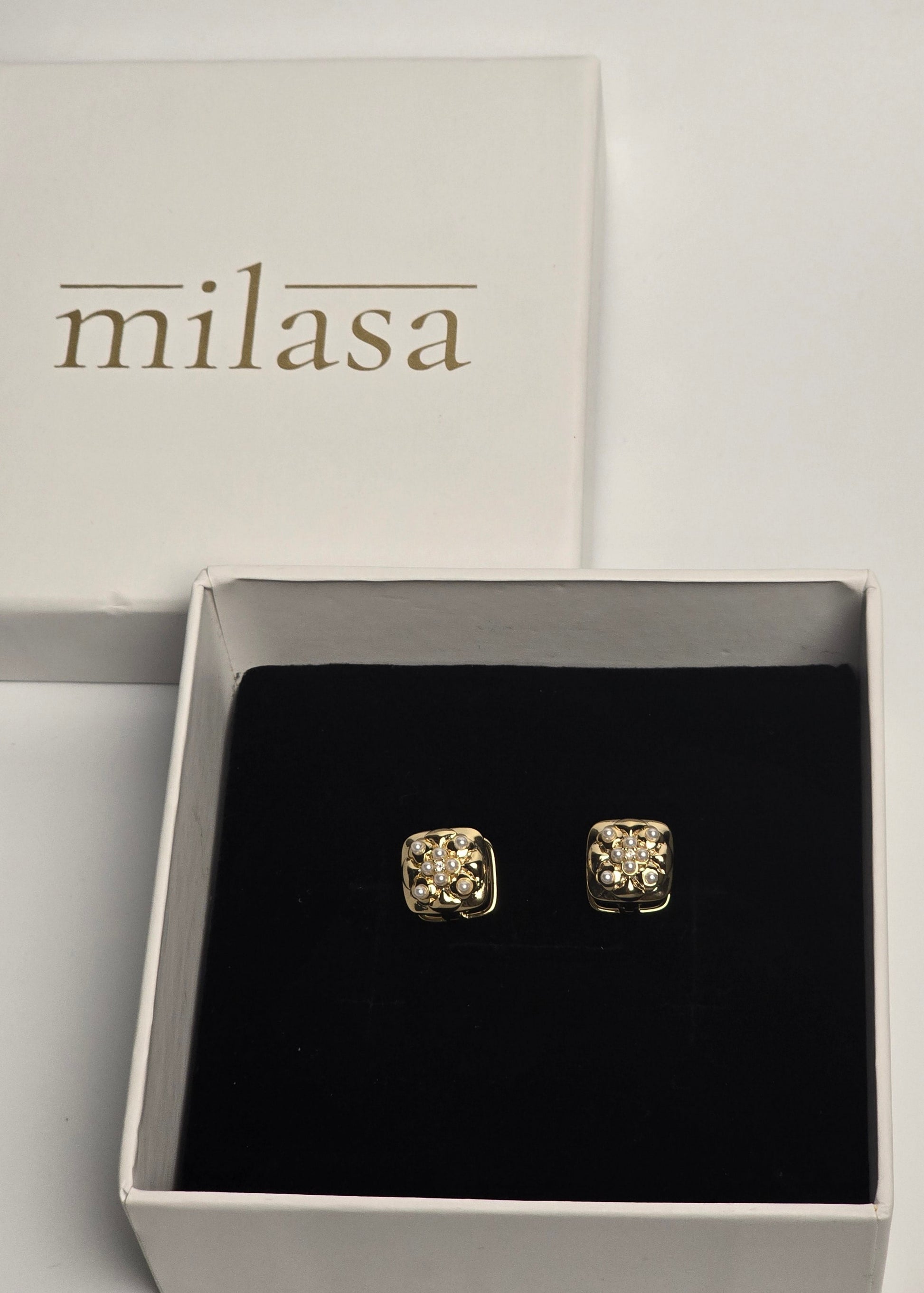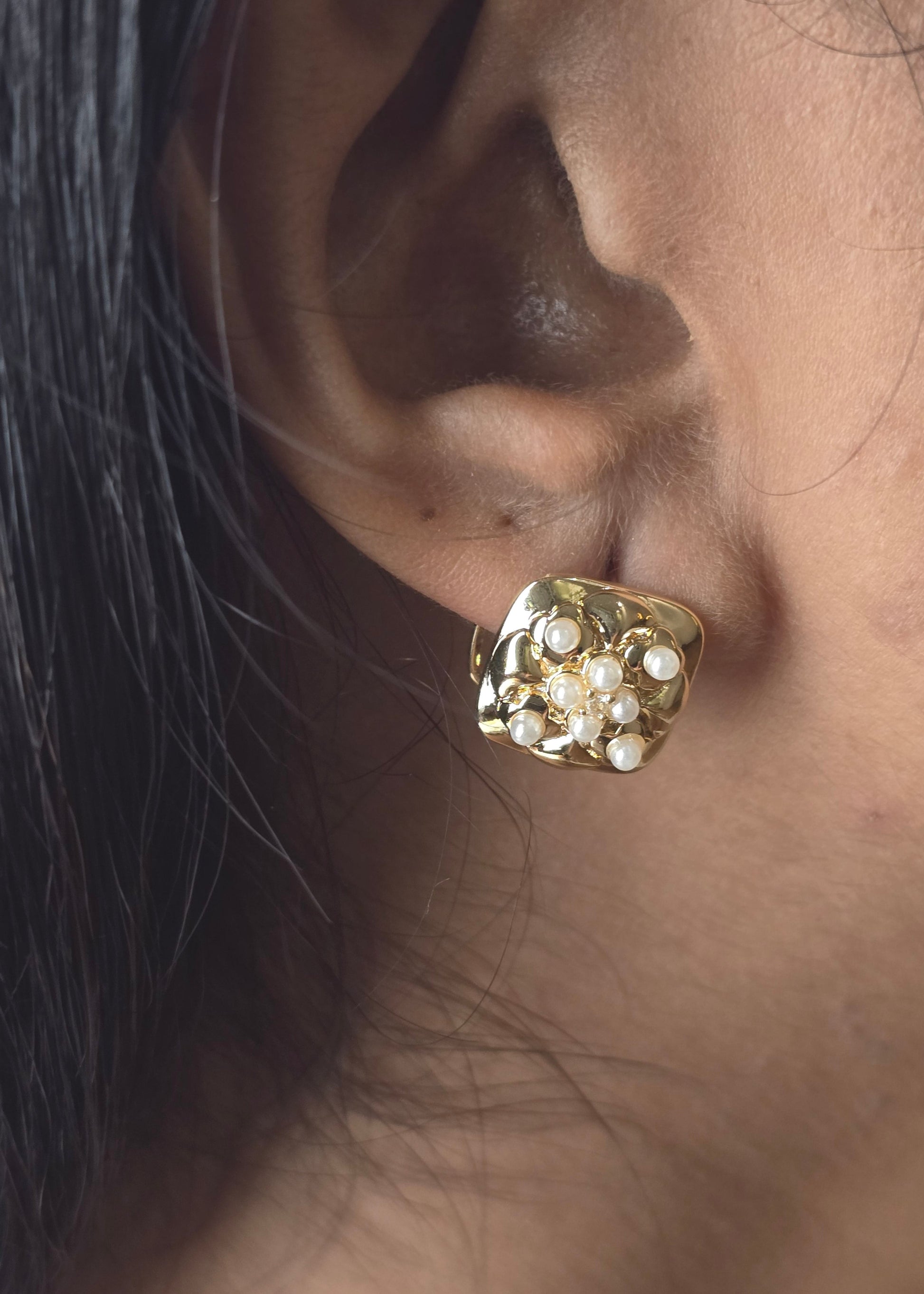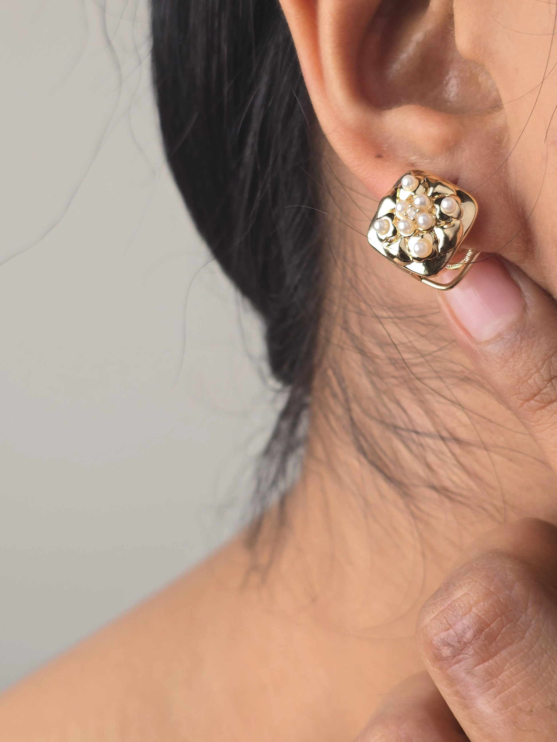 Square-shaped huggies with a delicate pearl detail at the center — a balance of structure and softness. Crafted in high-quality stainless steel, tarnish-free and versatile for everyday wear.