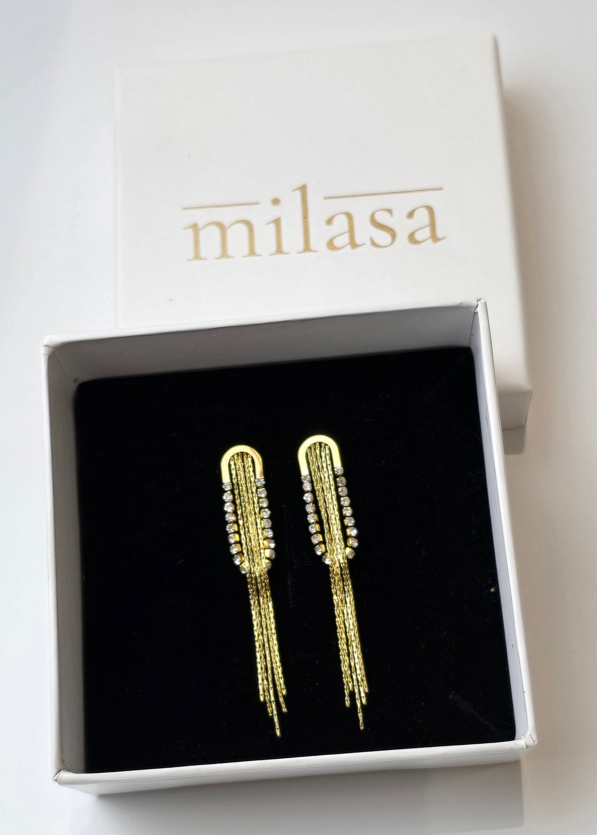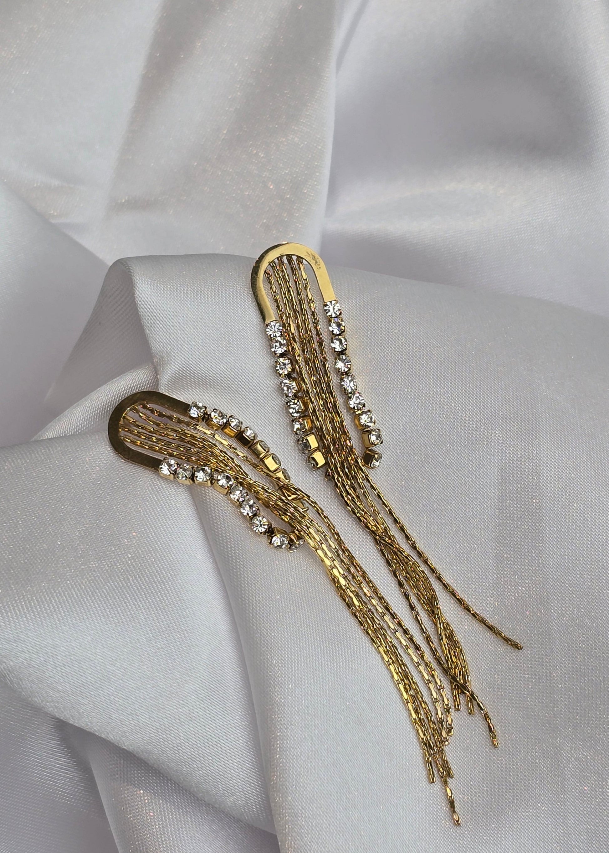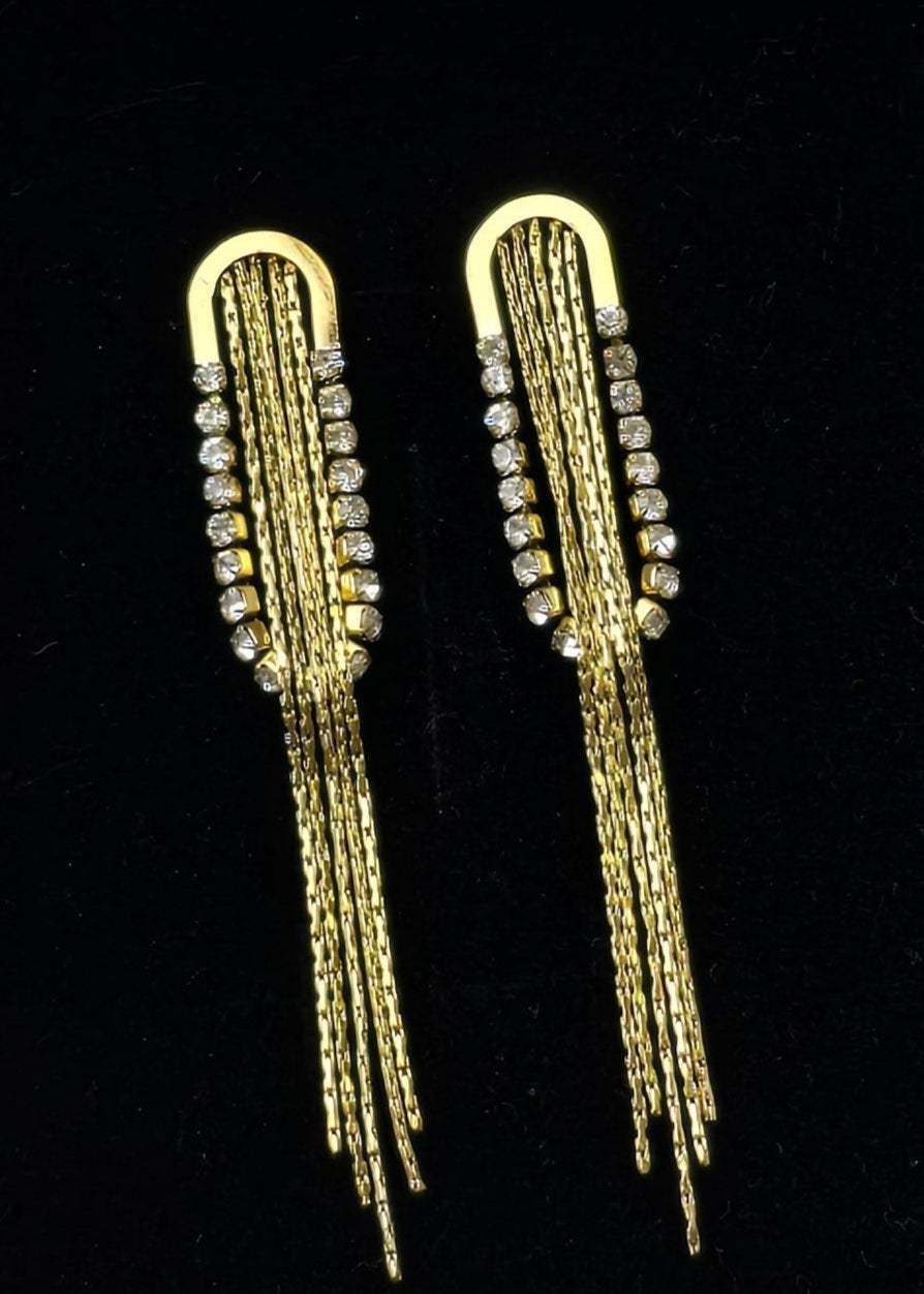 These are long, thread-style earrings in a soft gold finish, detailed with a single line of crystals down the centre. They're super lightweight and move beautifully when worn — the kind that catches light gently without feeling too much. Easy to wear, easy to style — perfect with Indian outfits, dresses, or even a clean white shirt.