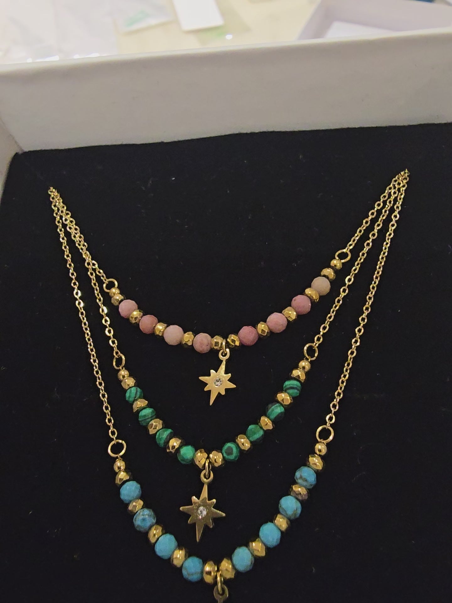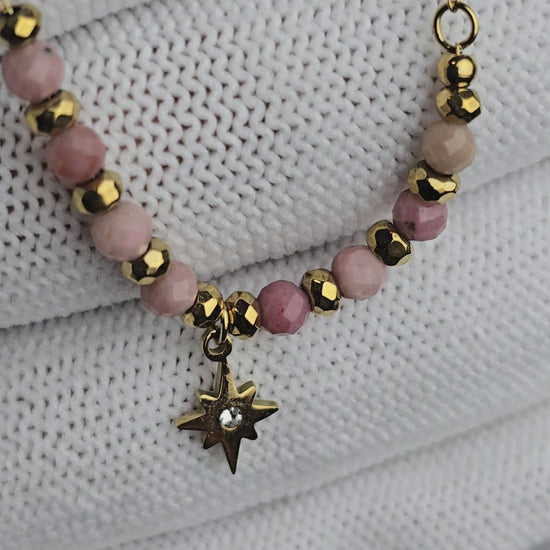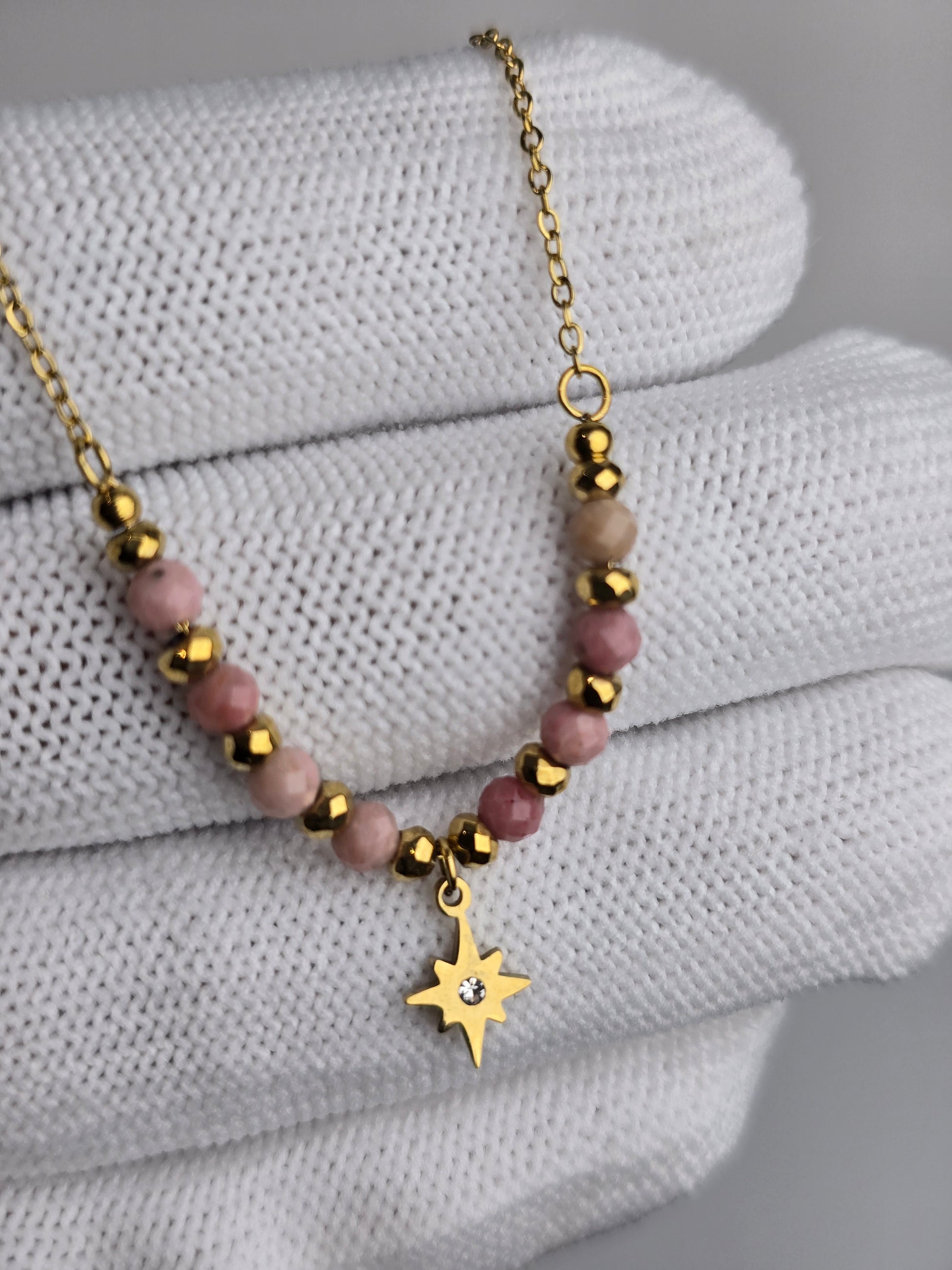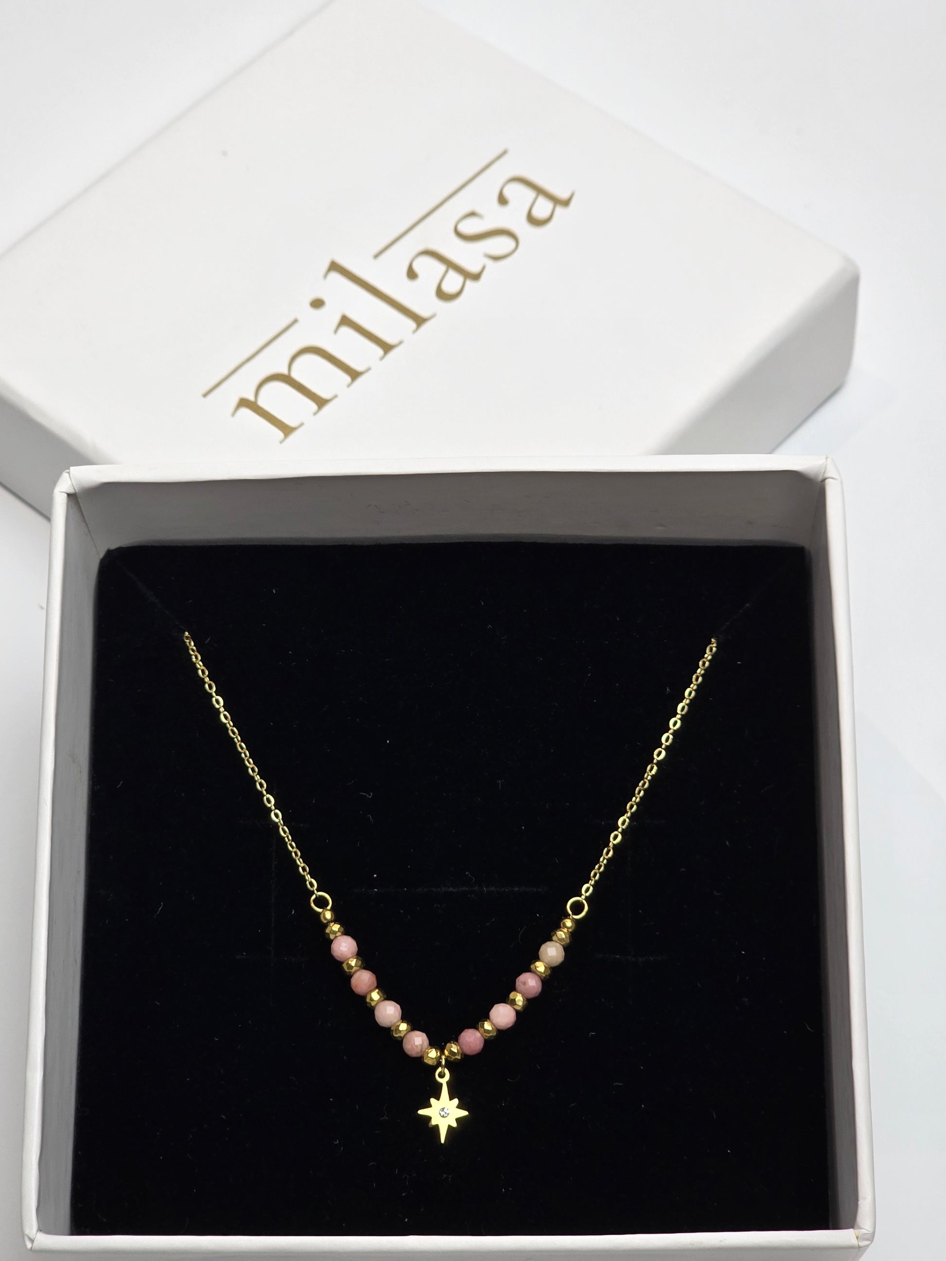A delicate blend of soft pink beads with a golden star charm, this necklace is feminine and versatile. It adds just the right hint of sweetness to your everyday style, while also slipping seamlessly into holiday looks.