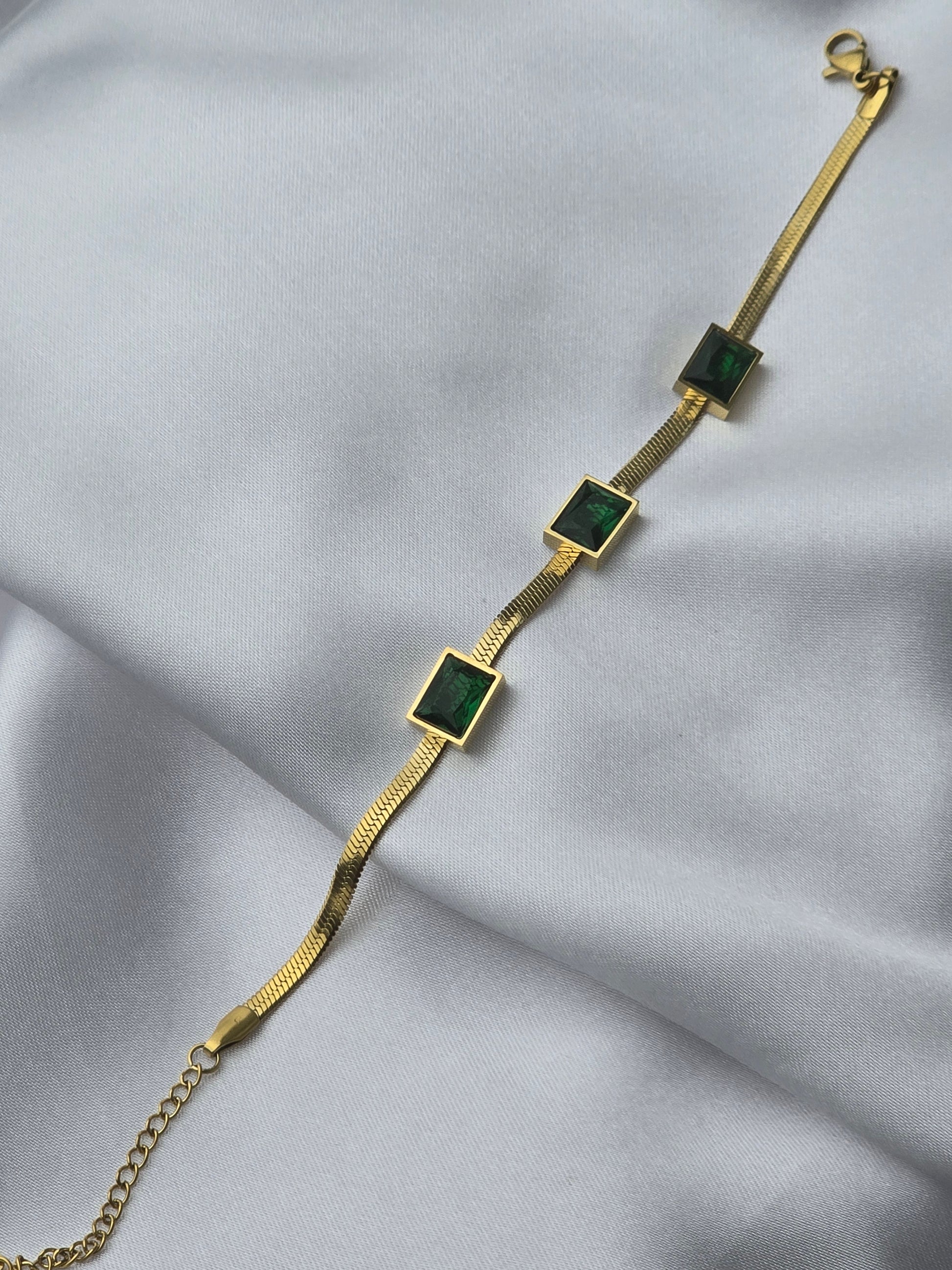 Elegant bracelet featuring three emerald stones, symbolizing growth and renewal.